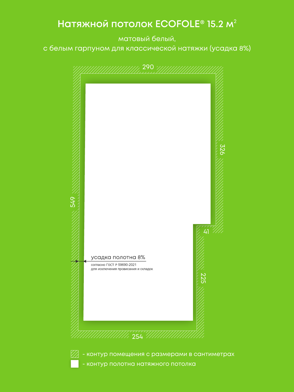 Натяжной потолок белый матовый, изготовленный по индивидуальным размерам покупателя, для кухни площадью 15.2 м2