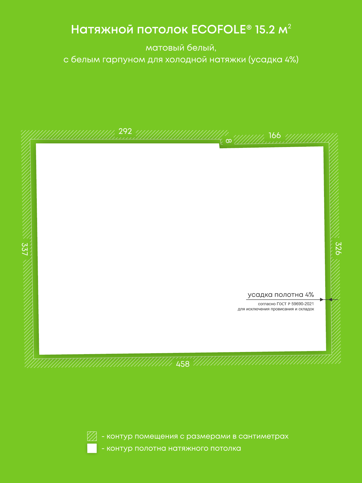 Натяжной потолок белый матовый, изготовленный по индивидуальным размерам покупателя, для помещения площадью 15.2 м2