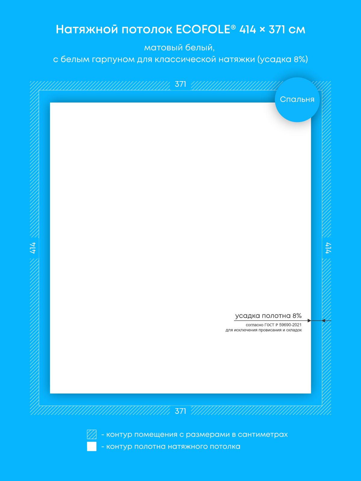 Натяжной потолок белый матовый, классической натяжки, изготовленный по индивидуальным размерам покупателя, для помещения площадью 15.4 м2