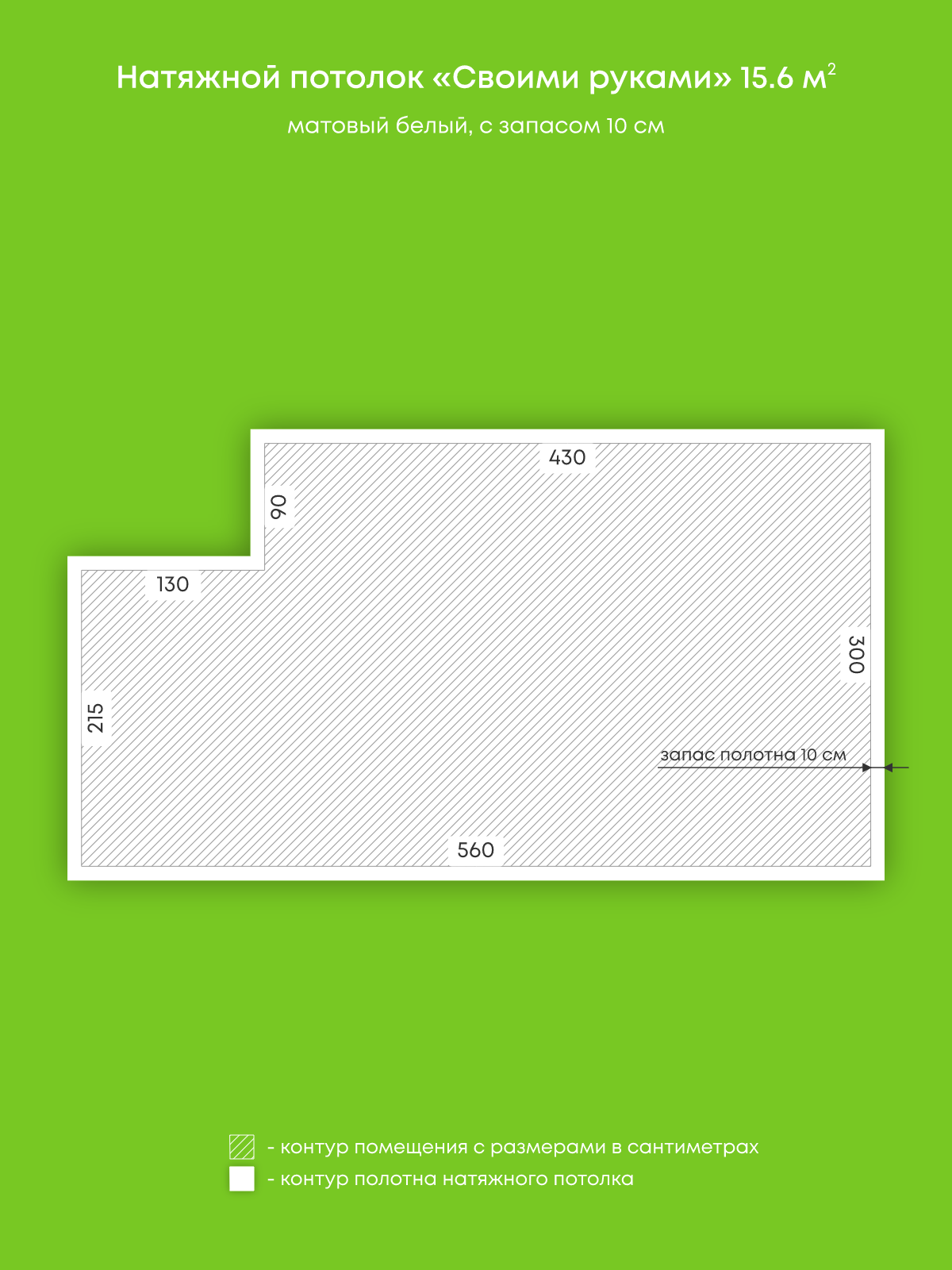 Натяжной потолок белый матовый, изготовленный по индивидуальным размерам покупателя, для гостиной площадью 15.6 м2