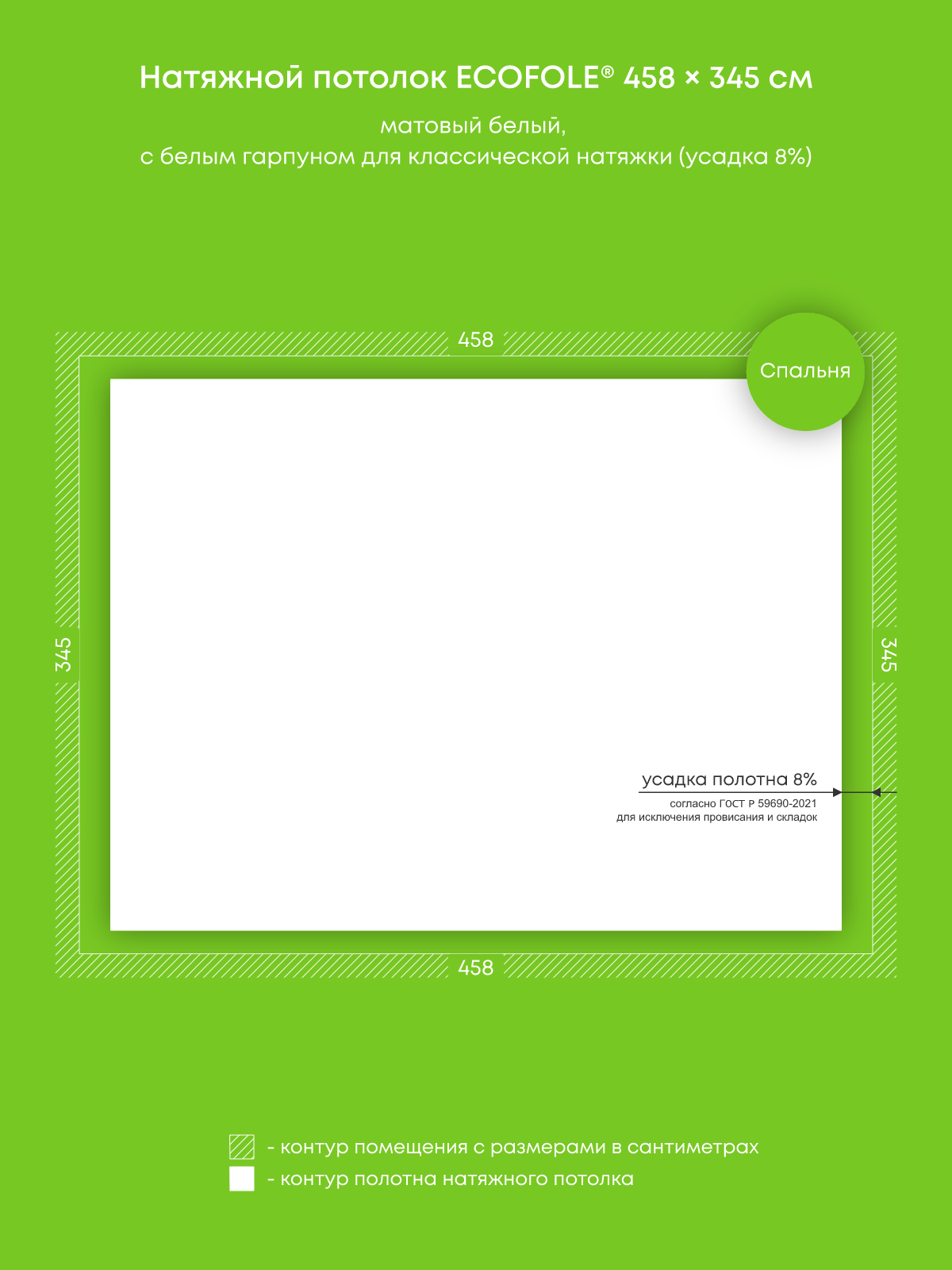 Натяжной потолок белый матовый, классической натяжки, изготовленный по индивидуальным размерам покупателя, для помещения площадью 15.8 м2