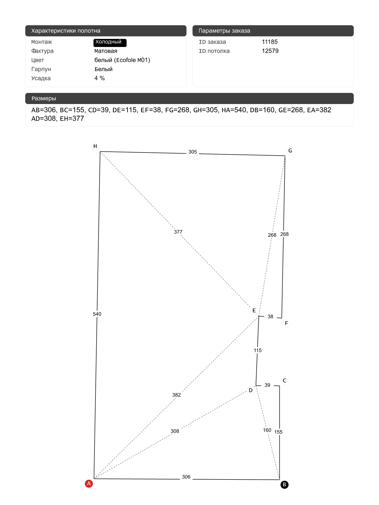 Натяжной потолок белый матовый, холодной натяжки, изготовленный по индивидуальным размерам покупателя, для помещения площадью 15.9 м2
