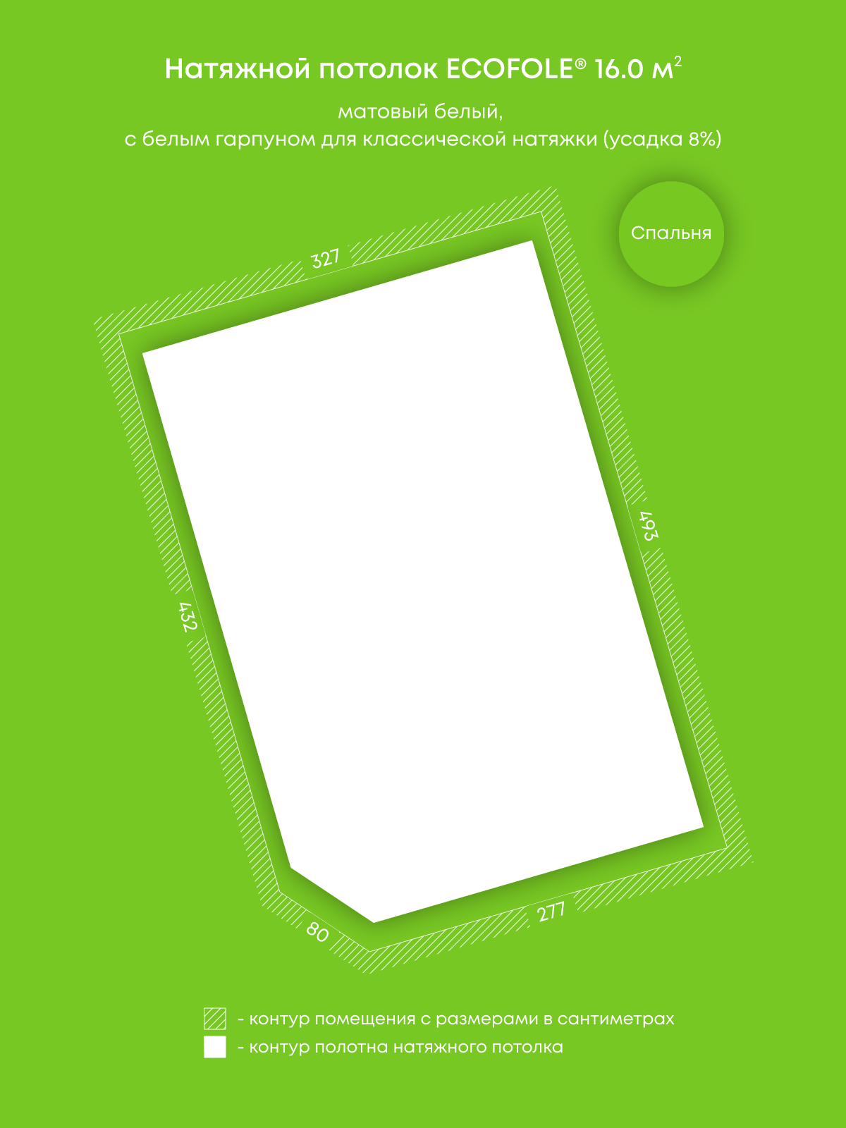 Натяжной потолок белый матовый, изготовленный по индивидуальным размерам покупателя, для спальни площадью 16 м2