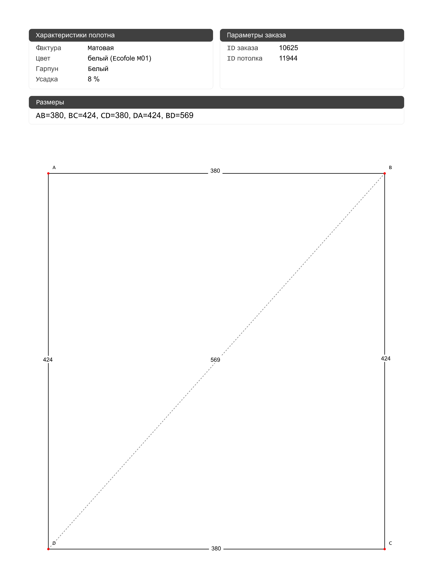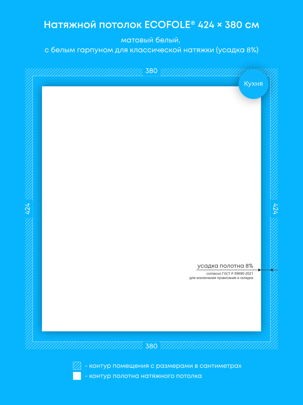 Натяжной потолок белый матовый, классической натяжки, изготовленный по индивидуальным размерам покупателя, для помещения площадью 16.1 м2
