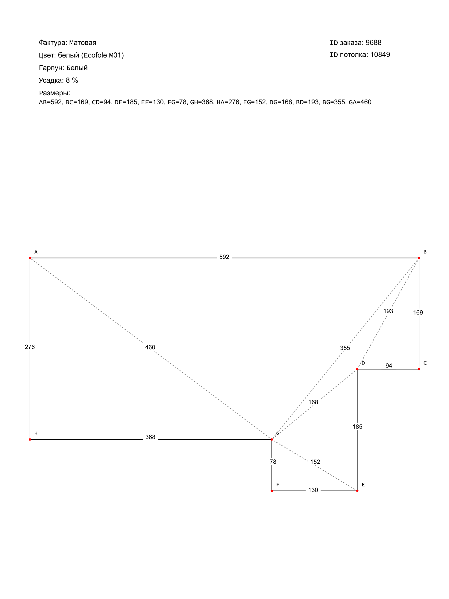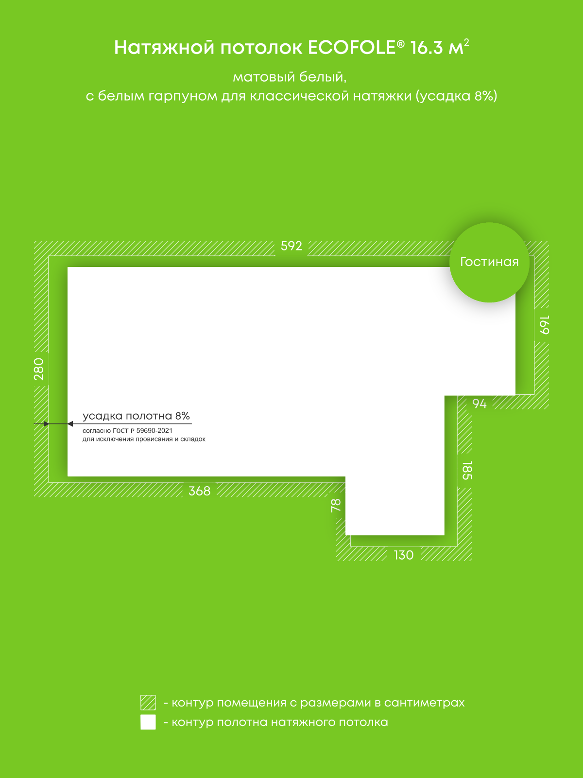 Натяжной потолок белый матовый, классической натяжки, изготовленный по индивидуальным размерам покупателя, для помещения площадью 16.3 м2