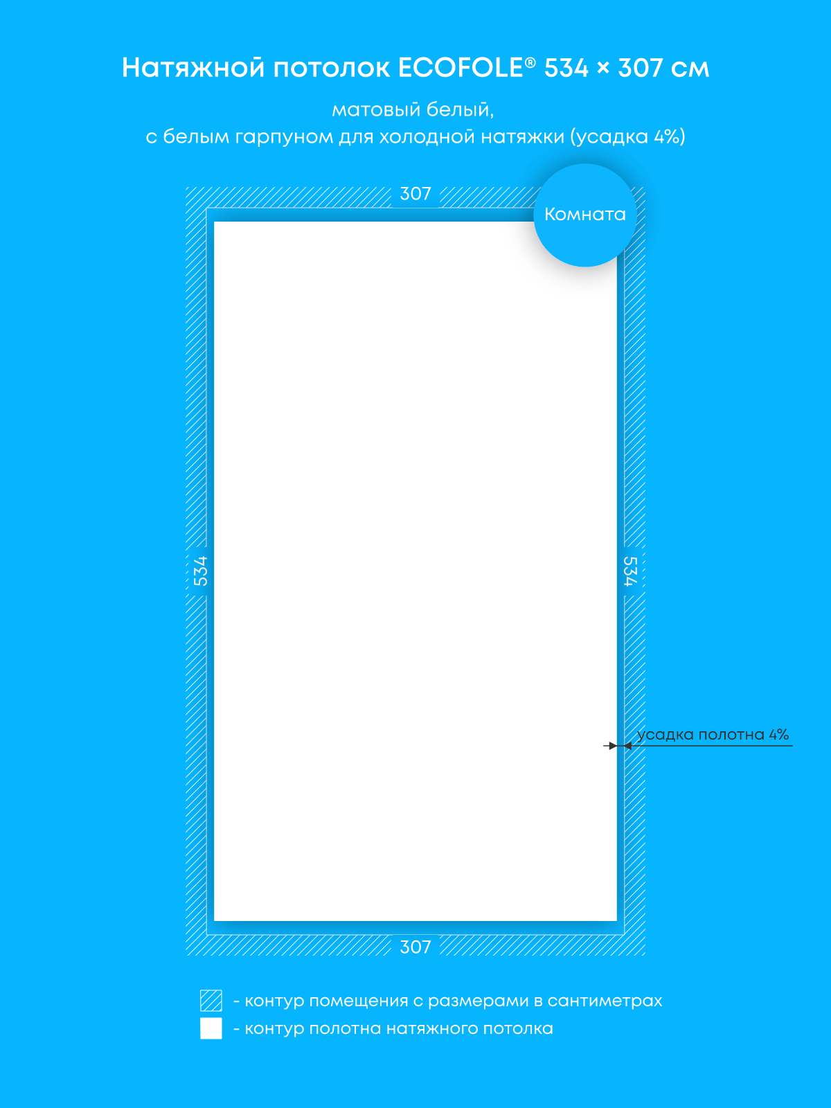 Натяжной потолок белый матовый, изготовленный по индивидуальным размерам покупателя, для комнаты площадью 16.4 м2