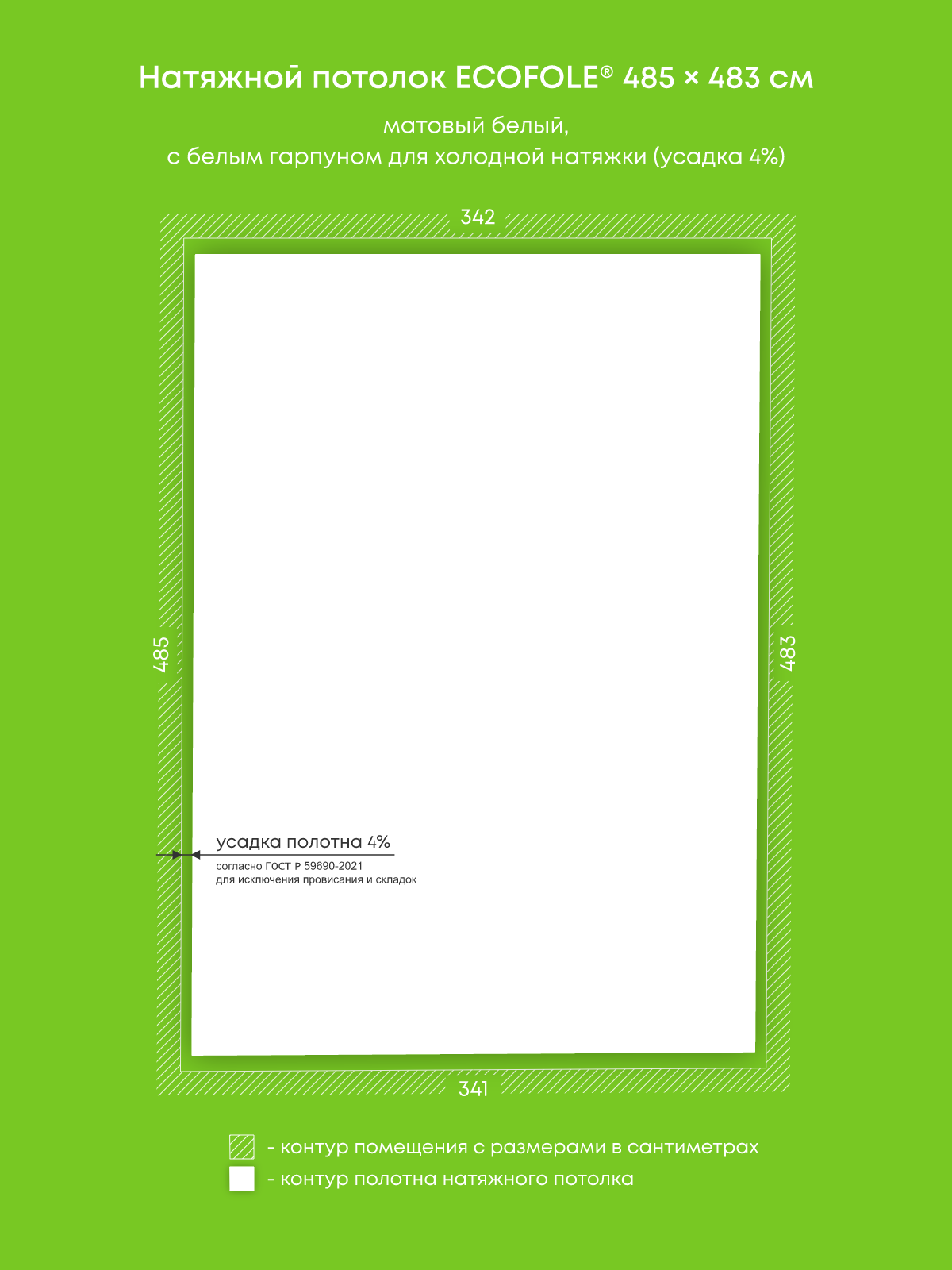 Натяжной потолок белый матовый, изготовленный по индивидуальным размерам покупателя, для гостиной площадью 16.5 м2