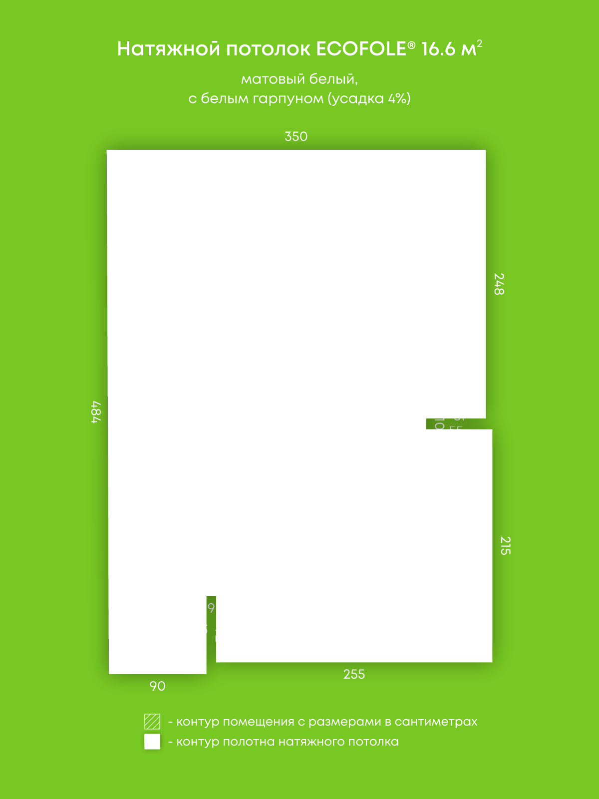 Натяжной потолок белый матовый, изготовленный по индивидуальным размерам покупателя, для помещения площадью 16.6 м2