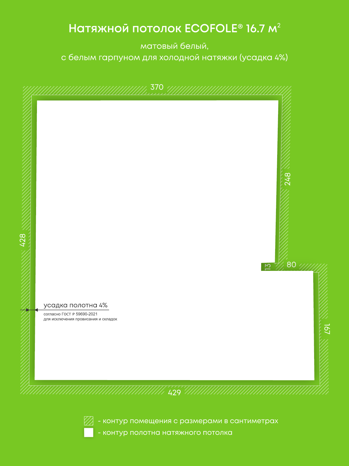 Натяжной потолок белый матовый, изготовленный по индивидуальным размерам покупателя, для помещения площадью 16.7 м2