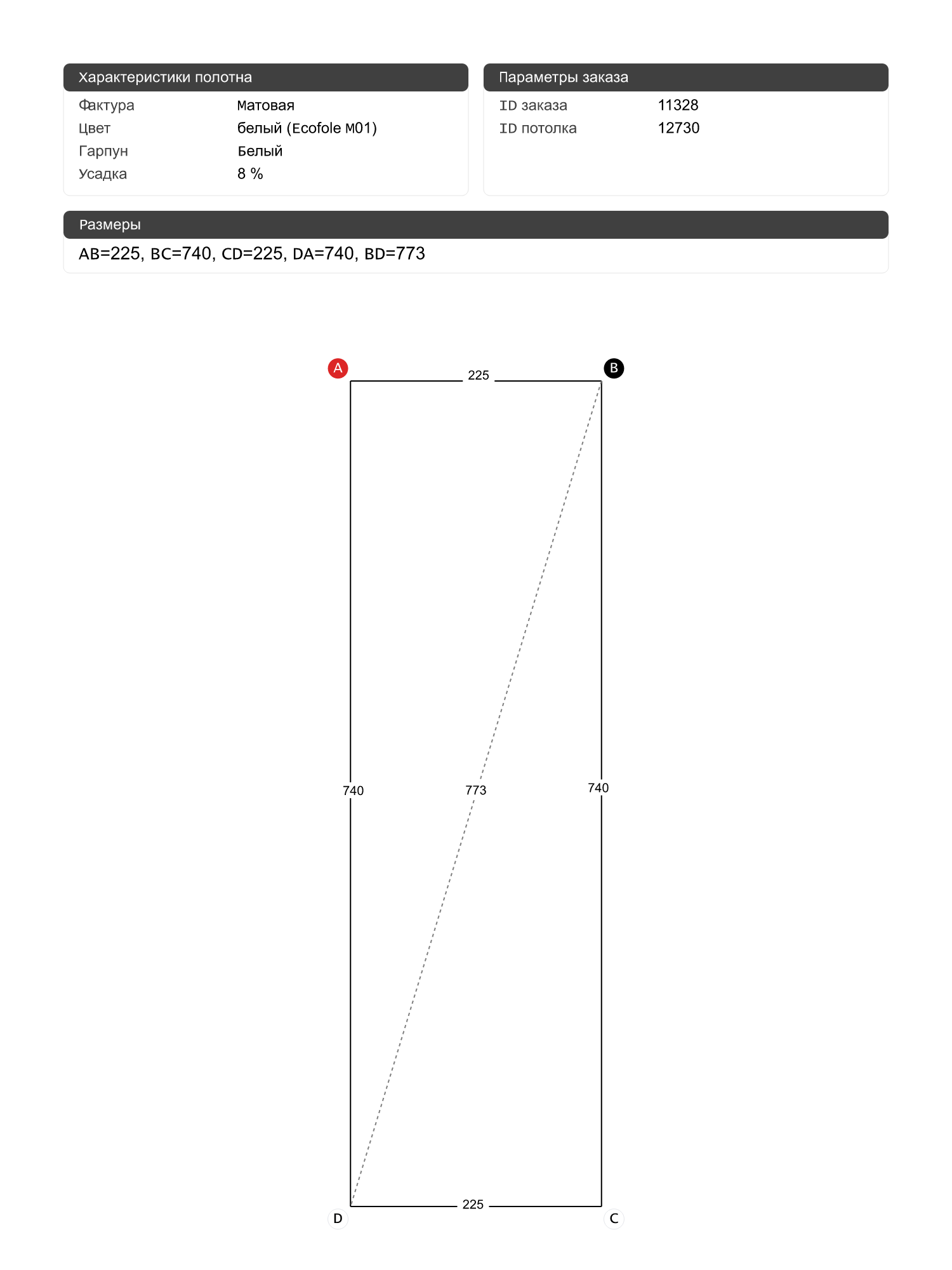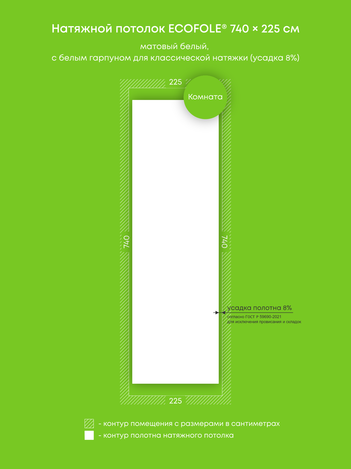 Натяжной потолок белый матовый, классической натяжки, изготовленный по индивидуальным размерам покупателя, для помещения площадью 16.7 м2