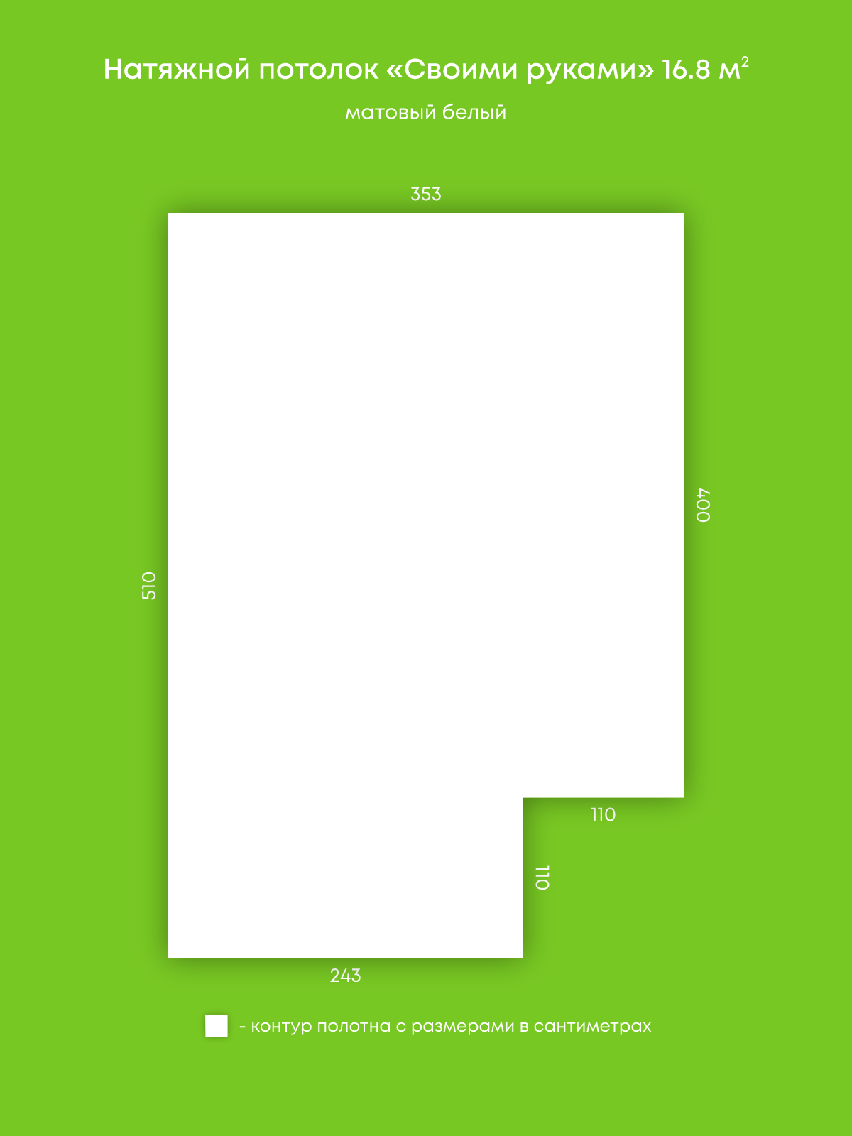 Натяжной потолок белый матовый, изготовленный по индивидуальным размерам покупателя, для помещения площадью 16.8 м2