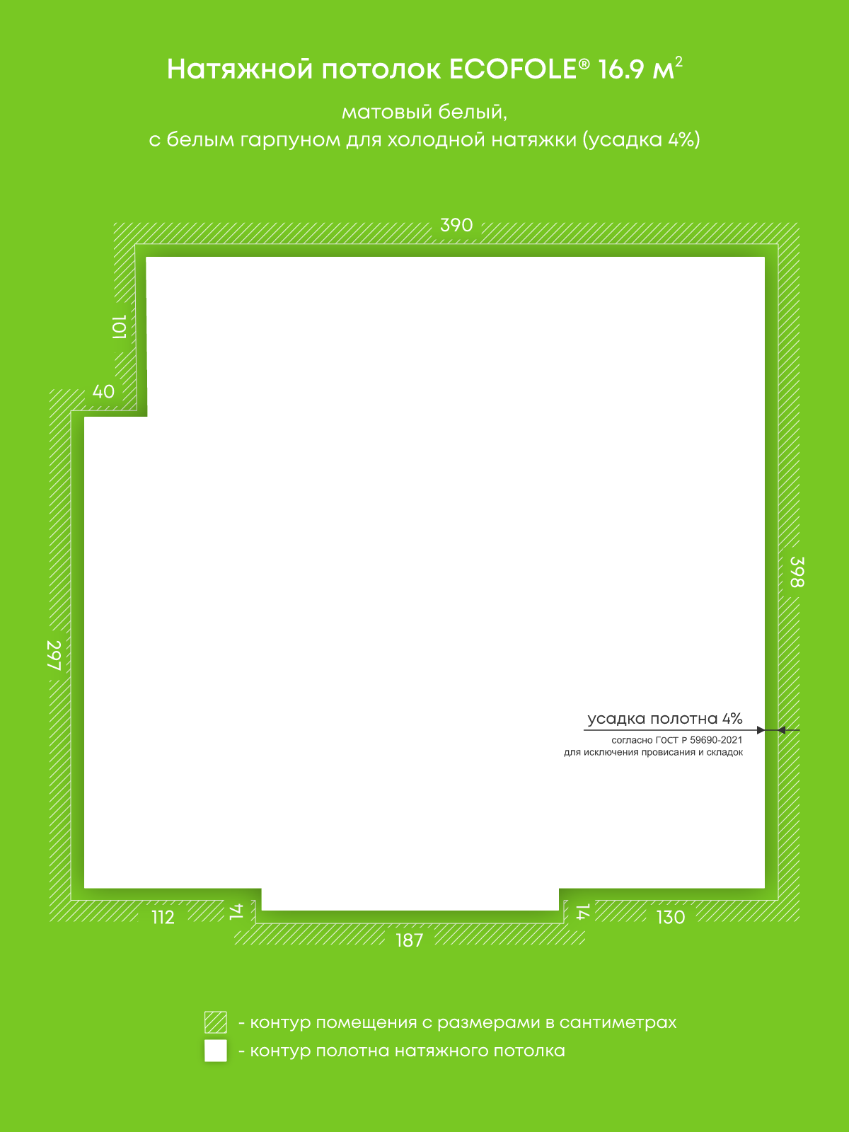 Натяжной потолок белый матовый, изготовленный по индивидуальным размерам покупателя, для кухни площадью 16.9 м2