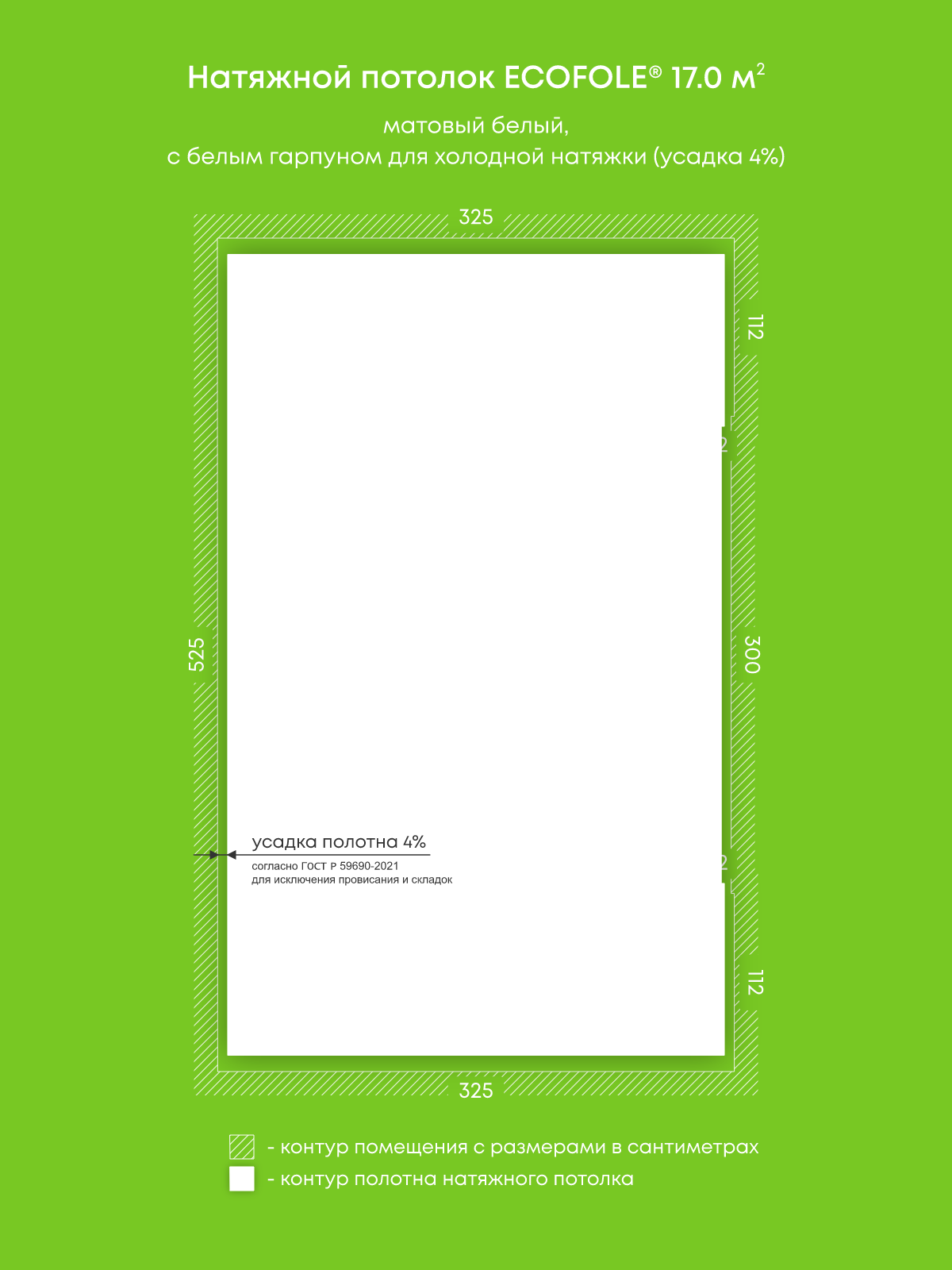 Натяжной потолок белый матовый, изготовленный по индивидуальным размерам покупателя, для комнаты площадью 17 м2
