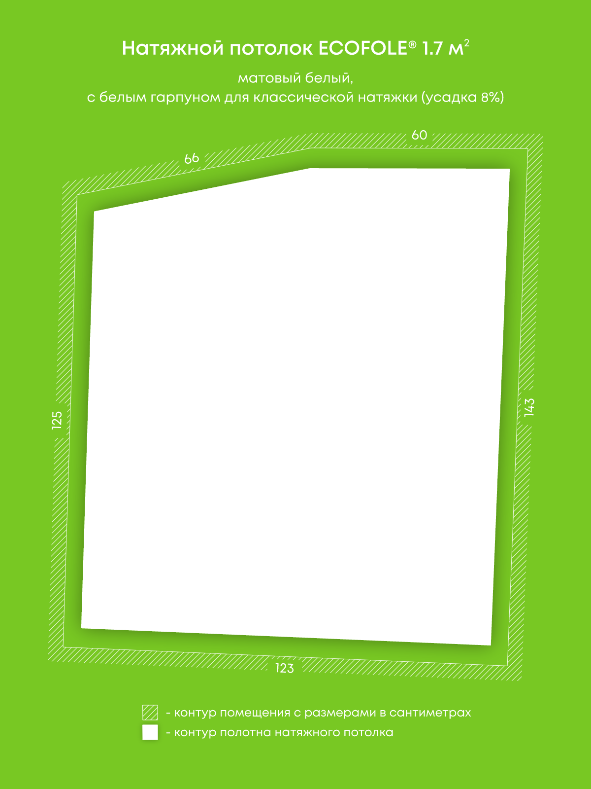 Натяжной потолок белый матовый, изготовленный по индивидуальным размерам покупателя, для ванной площадью 1.7 м2