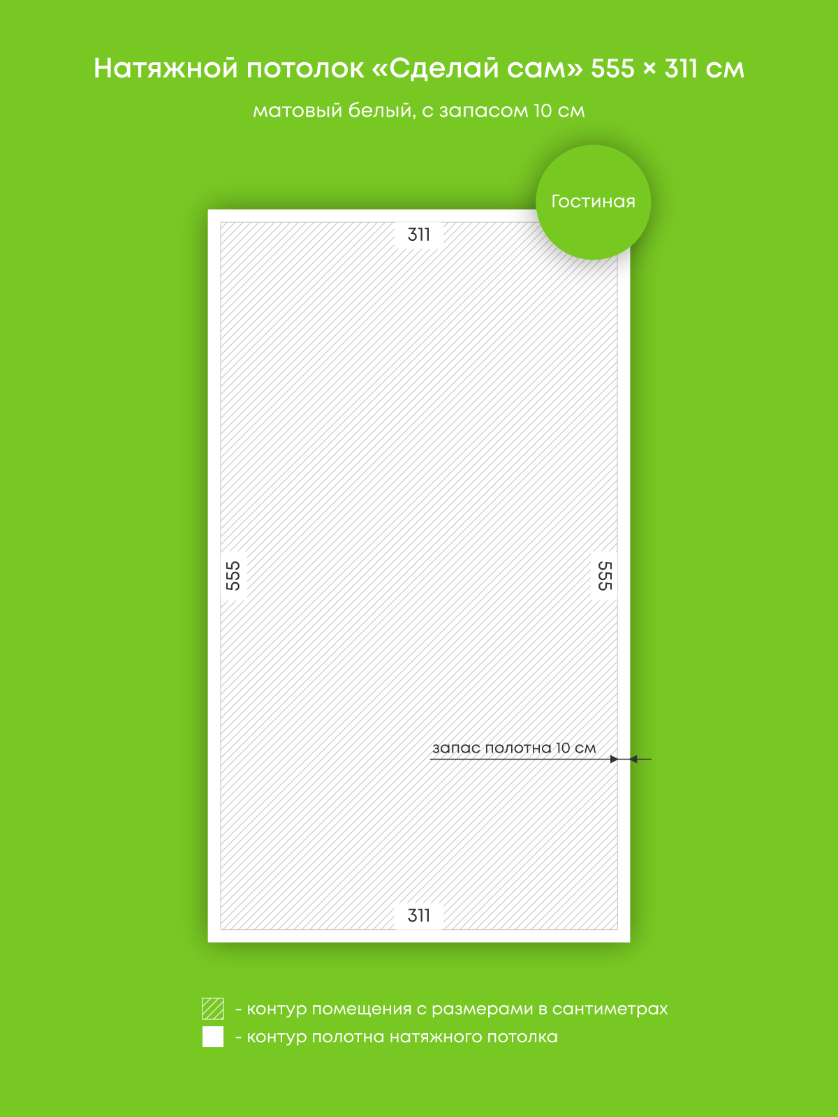 Натяжной потолок белый матовый, изготовленный по индивидуальным размерам покупателя, для гостиной площадью 17.3 м2