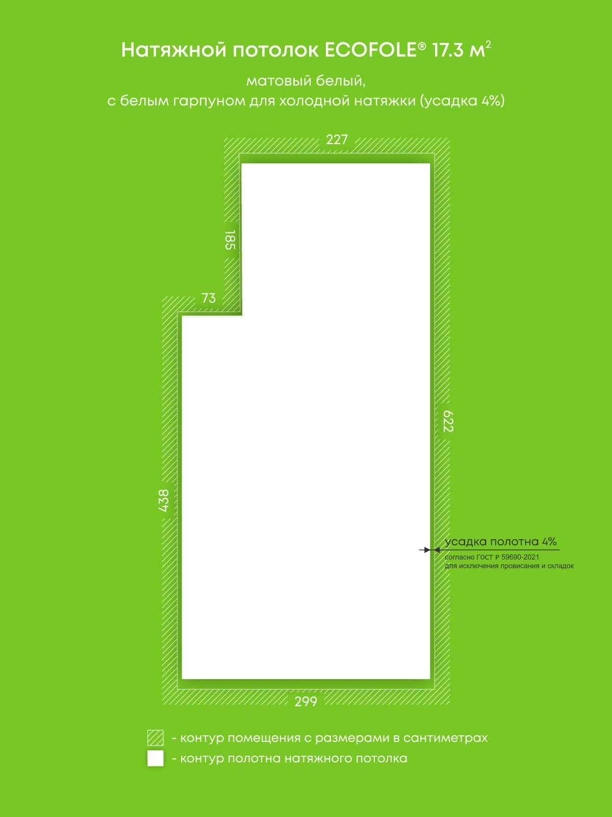 Натяжной потолок белый матовый, изготовленный по индивидуальным размерам покупателя, для кухни площадью 17.3 м2