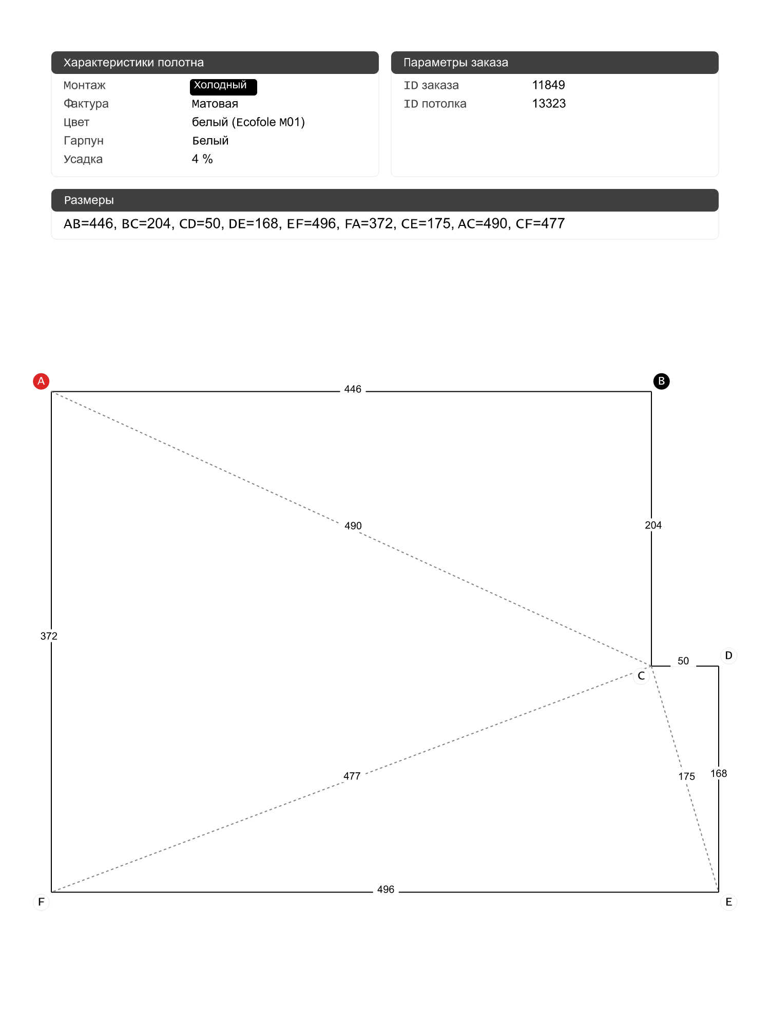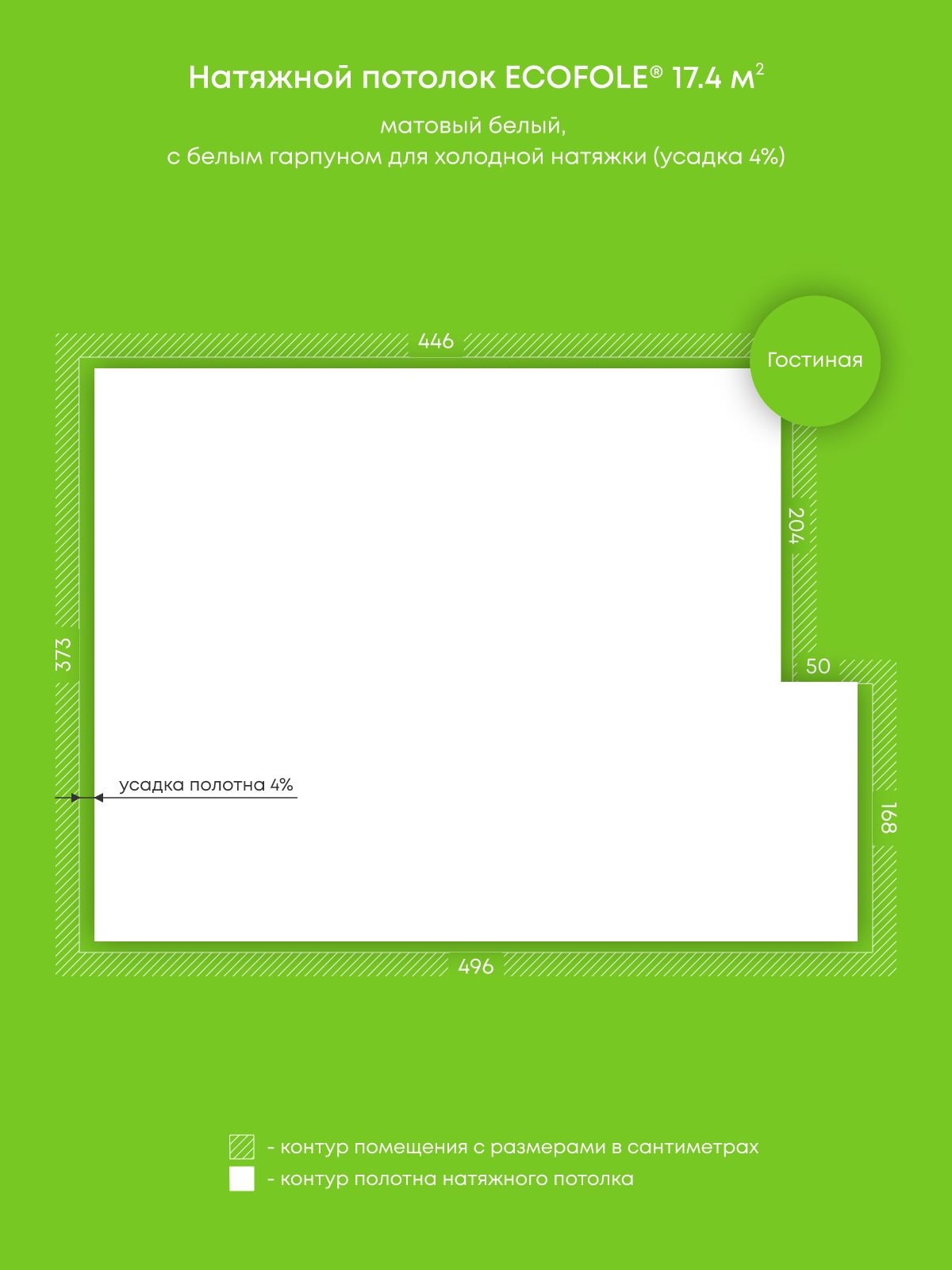 Натяжной потолок белый матовый, холодной натяжки, изготовленный по индивидуальным размерам покупателя, для помещения площадью 17.4 м2