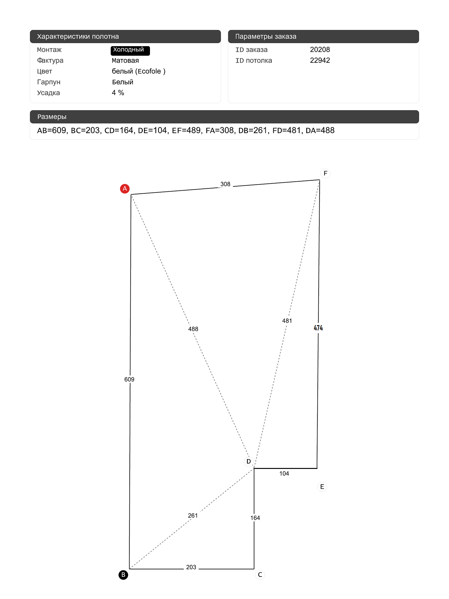 Натяжной потолок белый матовый, изготовленный по индивидуальным размерам покупателя, для спальни площадью 17.4 м2