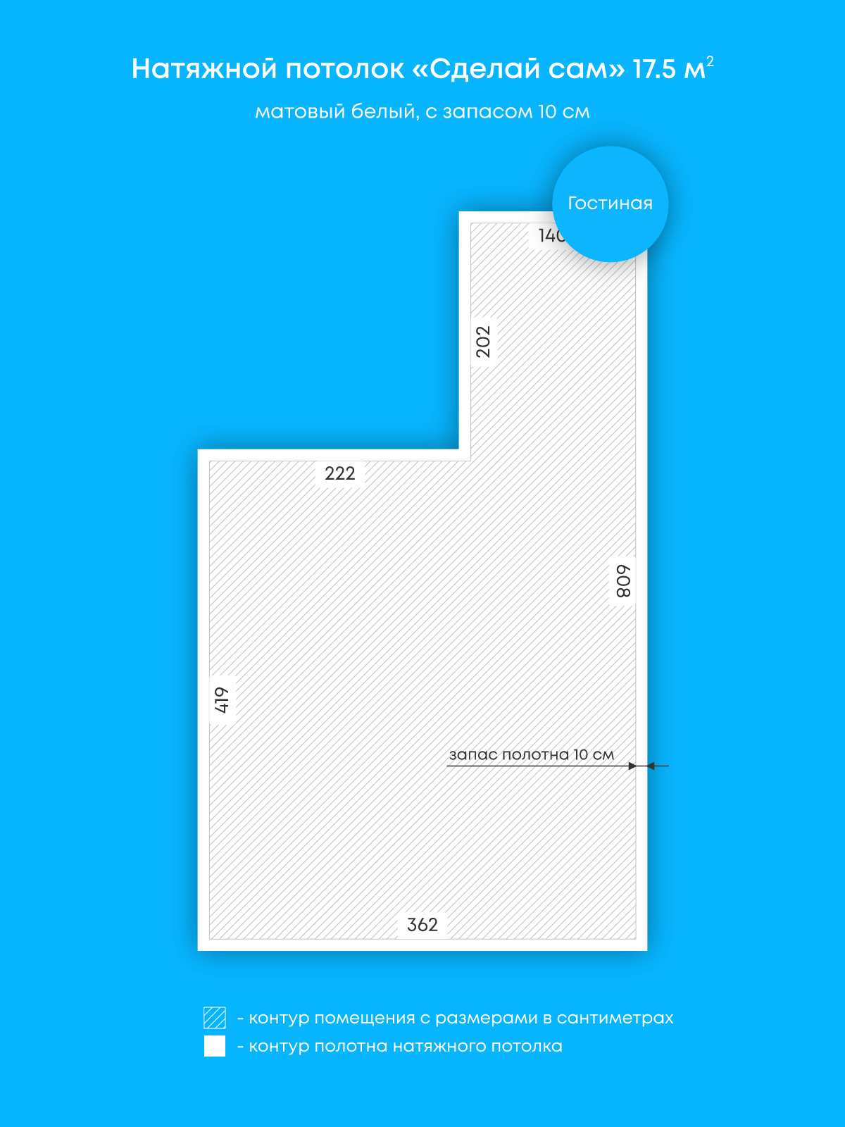 Натяжной потолок белый матовый, изготовленный по индивидуальным размерам покупателя, для гостиной площадью 17.5 м2