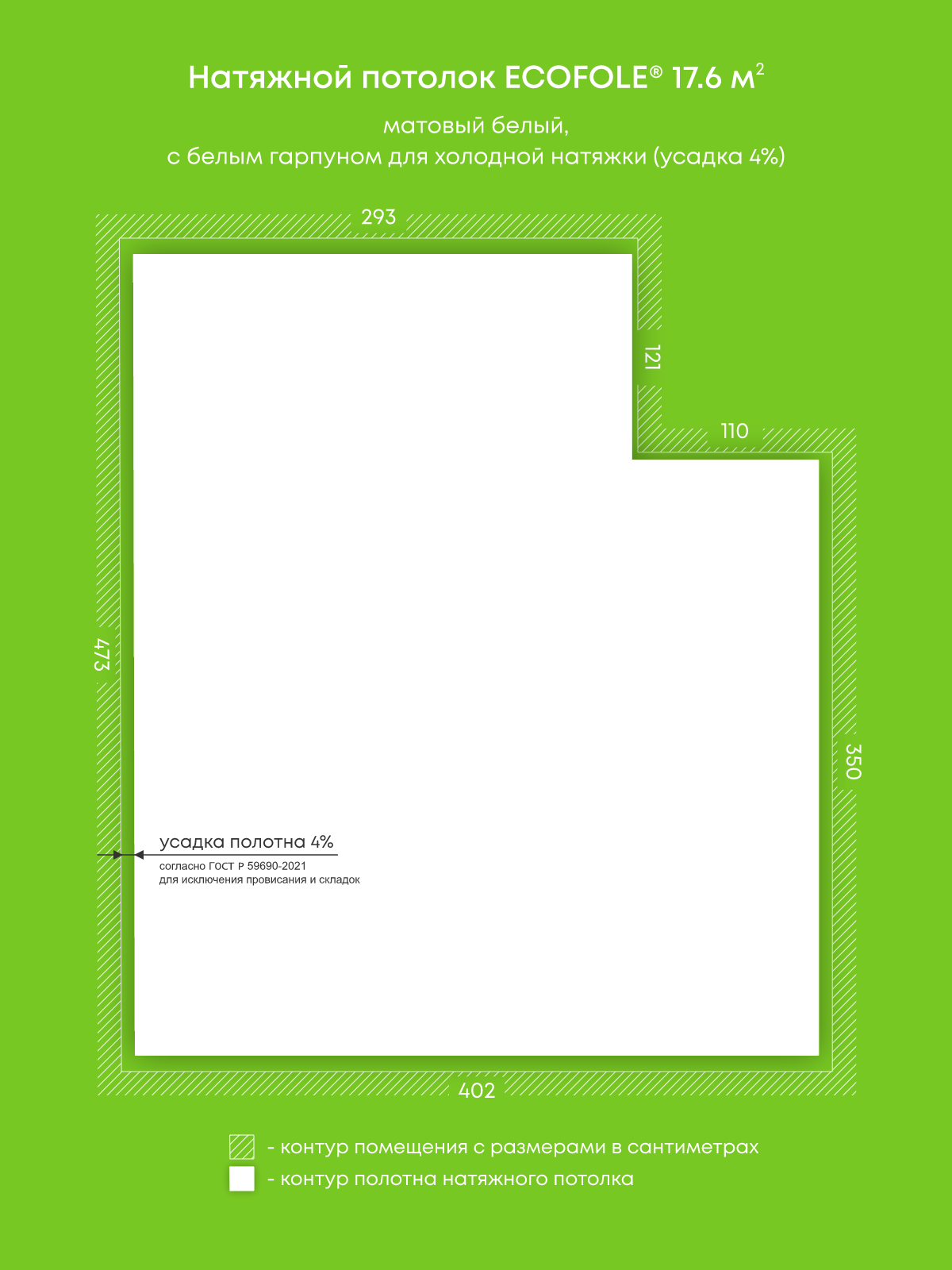 Натяжной потолок белый матовый, изготовленный по индивидуальным размерам покупателя, для комнаты площадью 17.6 м2