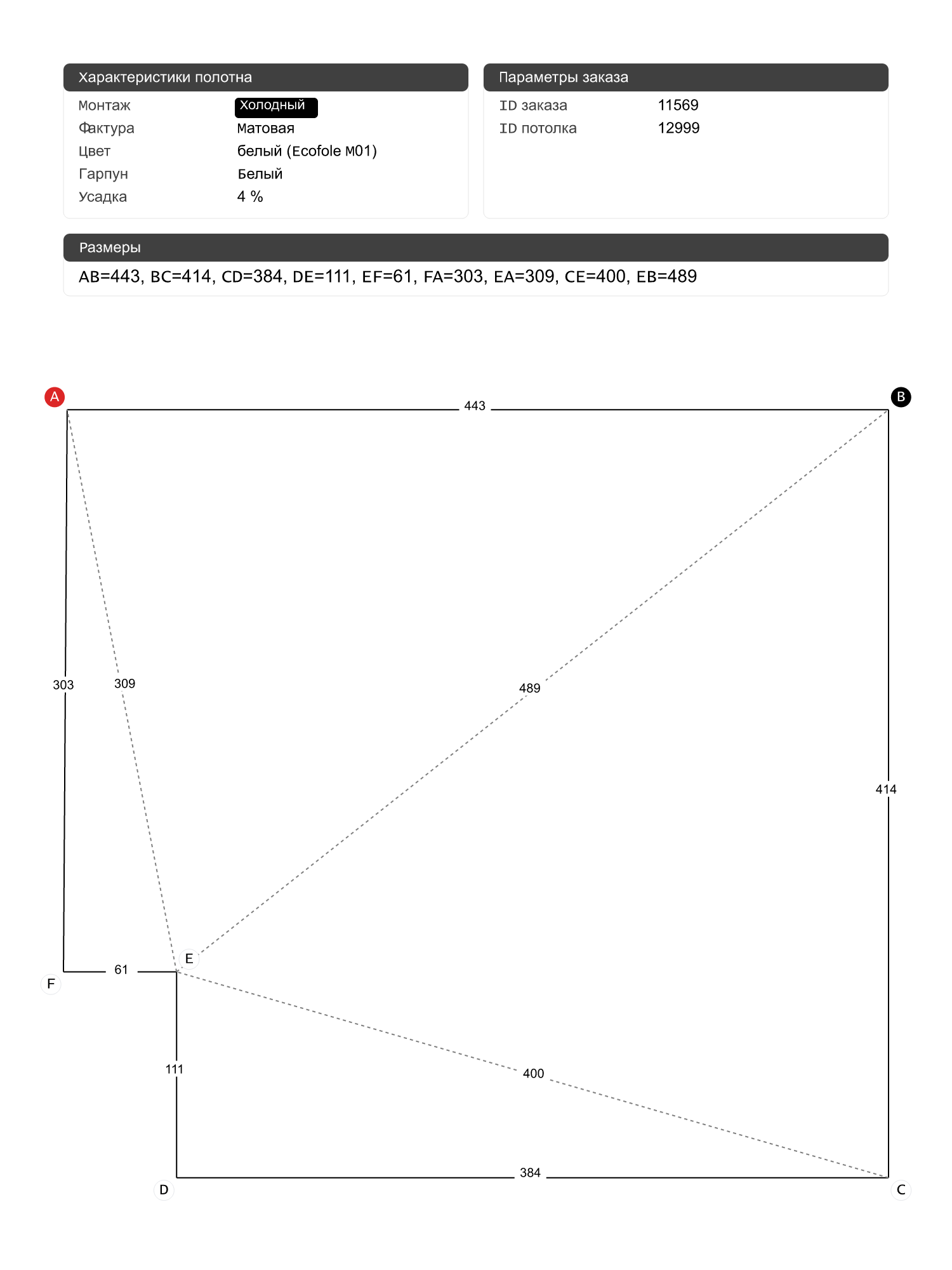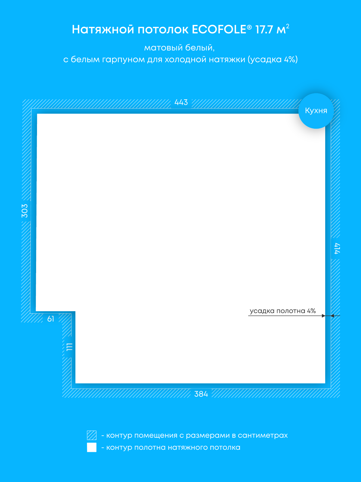 Натяжной потолок белый матовый, холодной натяжки, изготовленный по индивидуальным размерам покупателя, для помещения площадью 17.7 м2