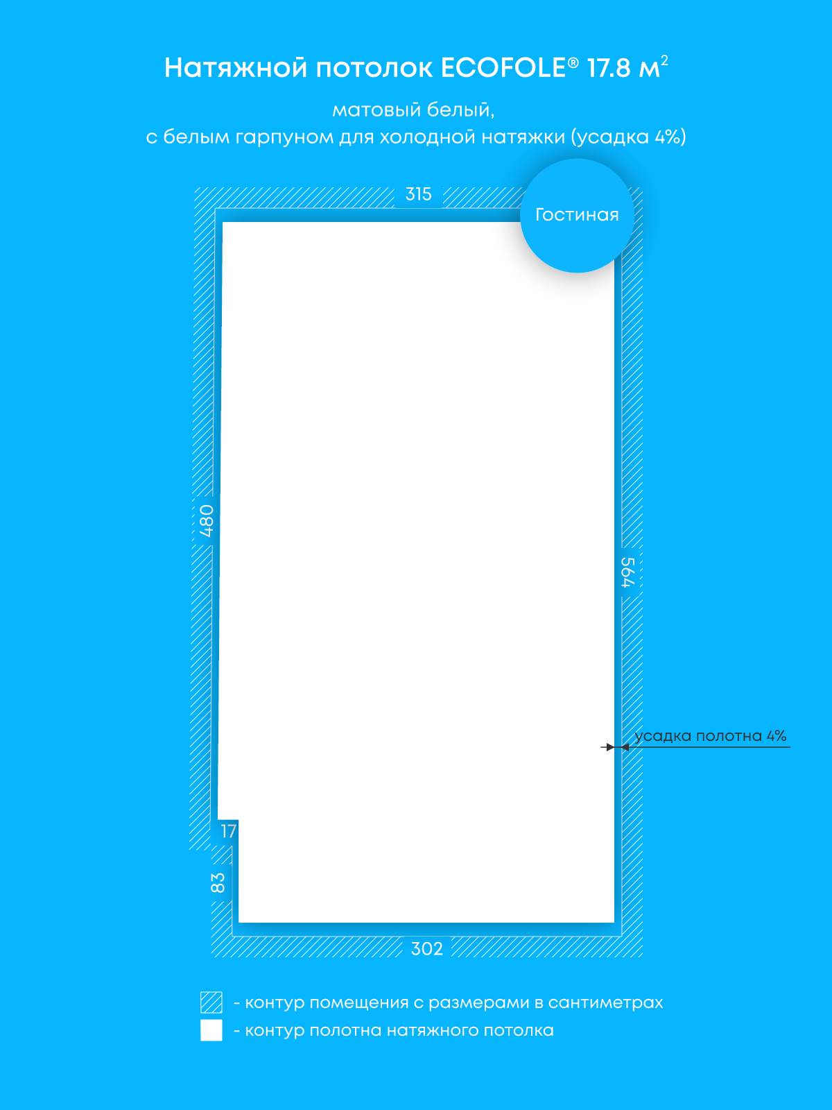 Натяжной потолок белый матовый, холодной натяжки, изготовленный по индивидуальным размерам покупателя, для помещения площадью 17.8 м2