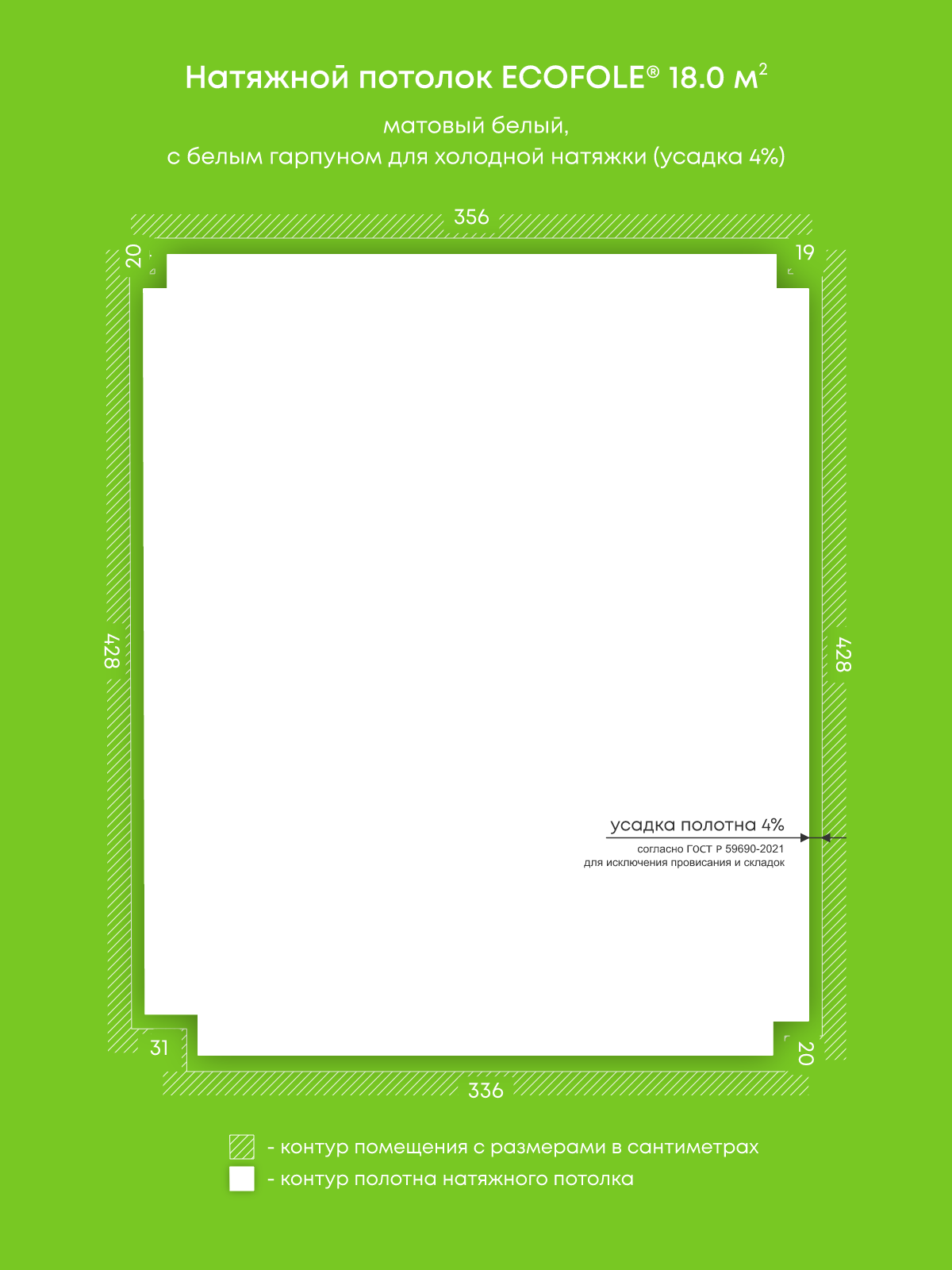 Натяжной потолок белый матовый, изготовленный по индивидуальным размерам покупателя, для комнаты площадью 18 м2