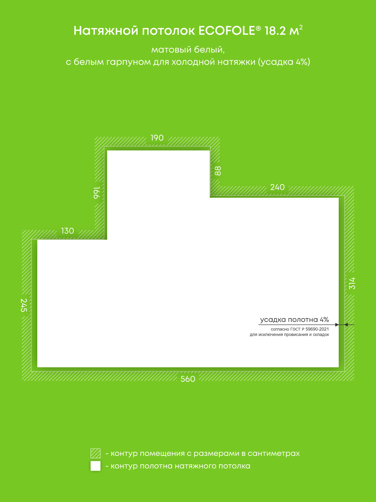 Натяжной потолок белый матовый, изготовленный по индивидуальным размерам покупателя, для комнаты площадью 18.2 м2