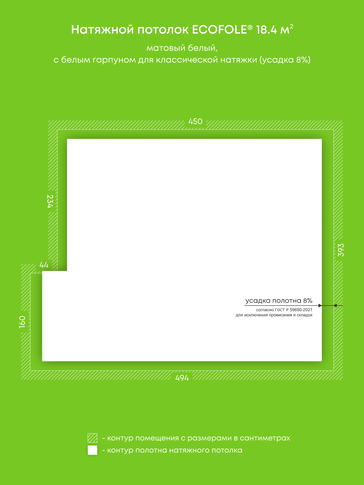 Натяжной потолок белый матовый, изготовленный по индивидуальным размерам покупателя, для комнаты площадью 18.4 м2
