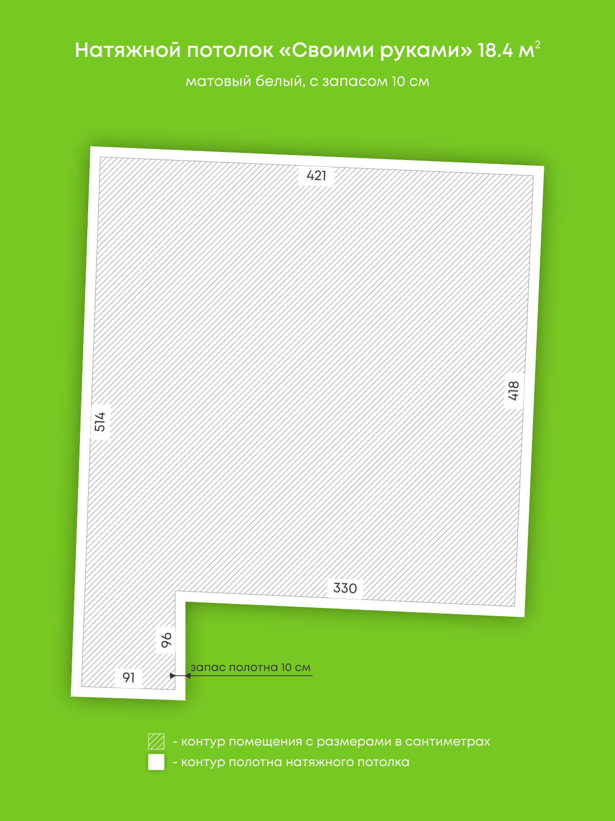 Натяжной потолок белый матовый, изготовленный по индивидуальным размерам покупателя, для кухни площадью 18.4 м2