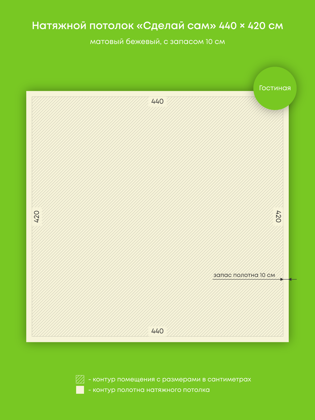 Натяжной потолок бежевый матовый, изготовленный по индивидуальным размерам покупателя, для гостиной площадью 18.5 м2