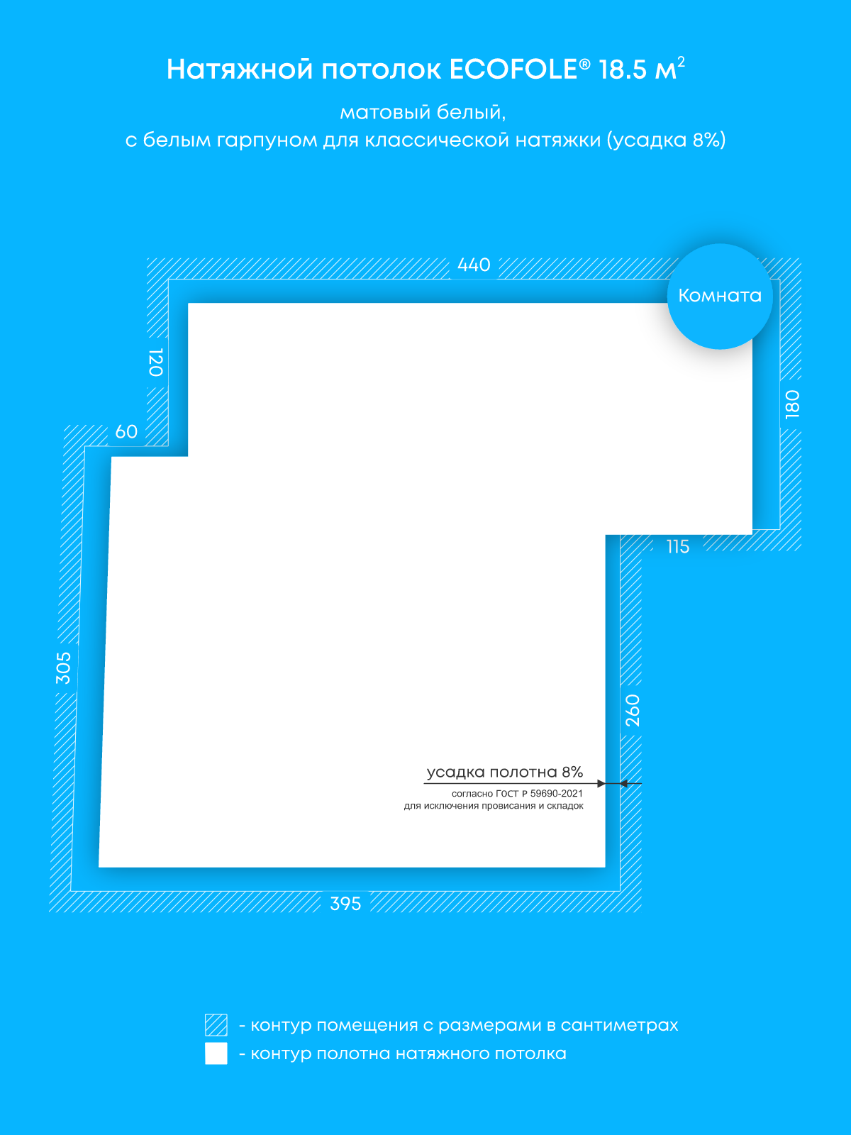 Натяжной потолок белый матовый, изготовленный по индивидуальным размерам покупателя, для комнаты площадью 18.5 м2
