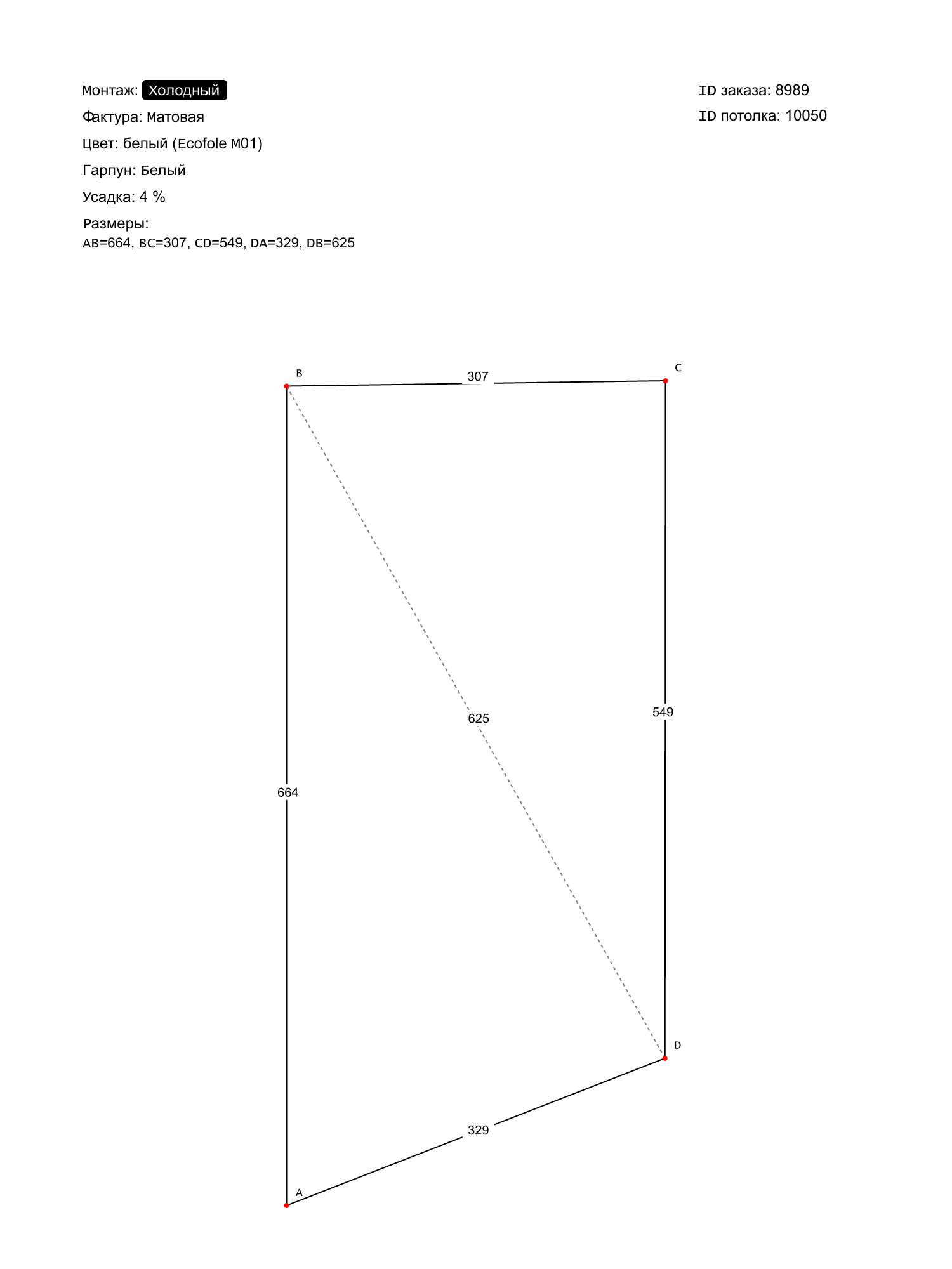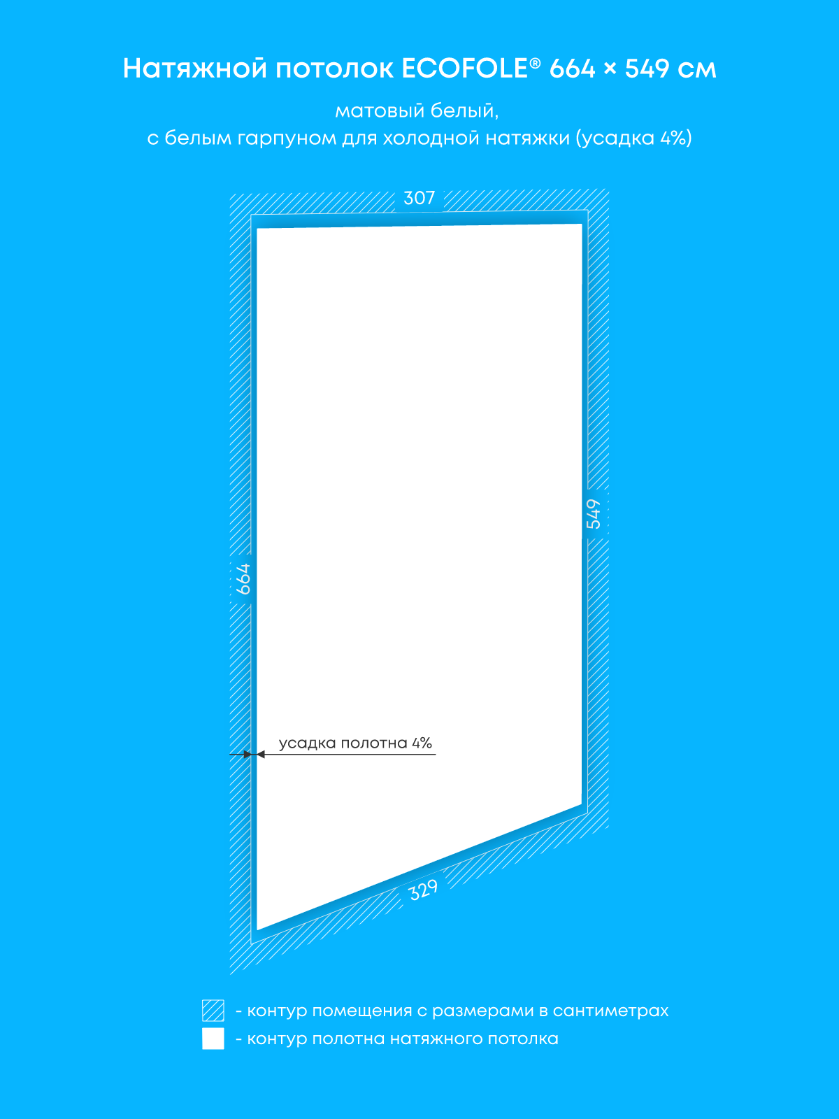 Натяжной потолок белый матовый, холодной натяжки, изготовленный по индивидуальным размерам покупателя, для помещения площадью 18.6 м2