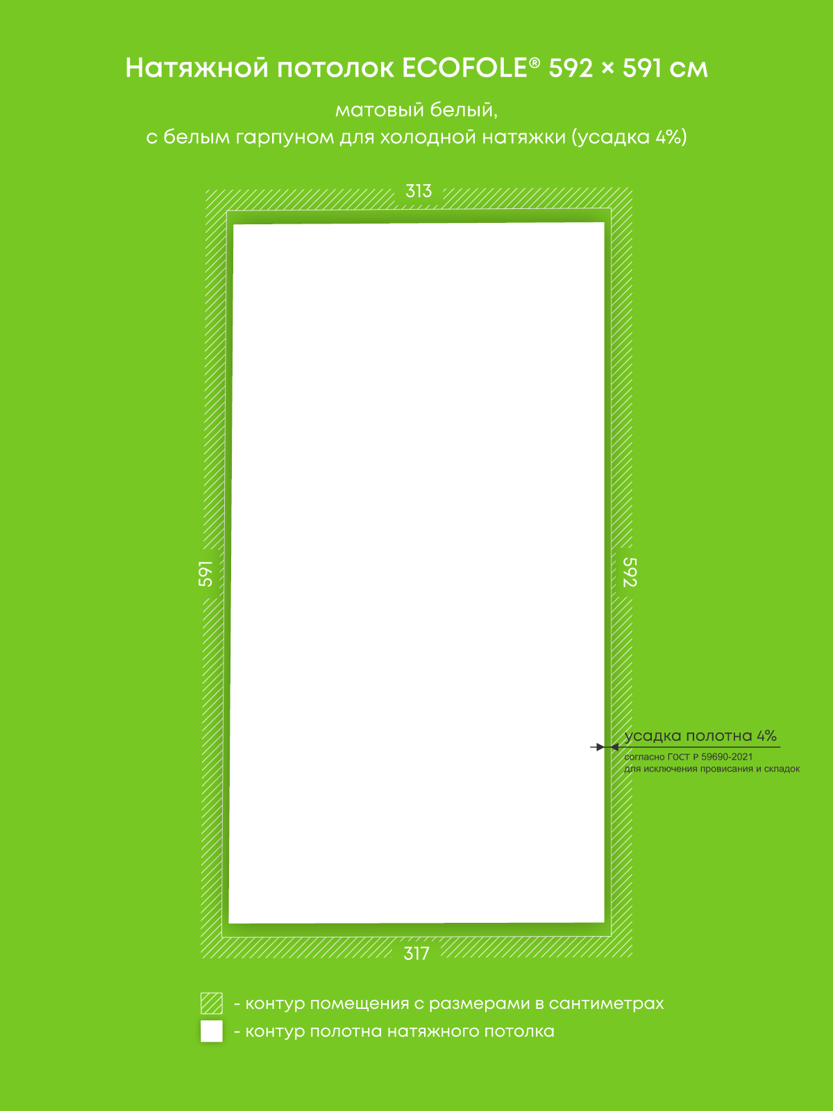 Натяжной потолок белый матовый, изготовленный по индивидуальным размерам покупателя, для комнаты площадью 18.6 м2