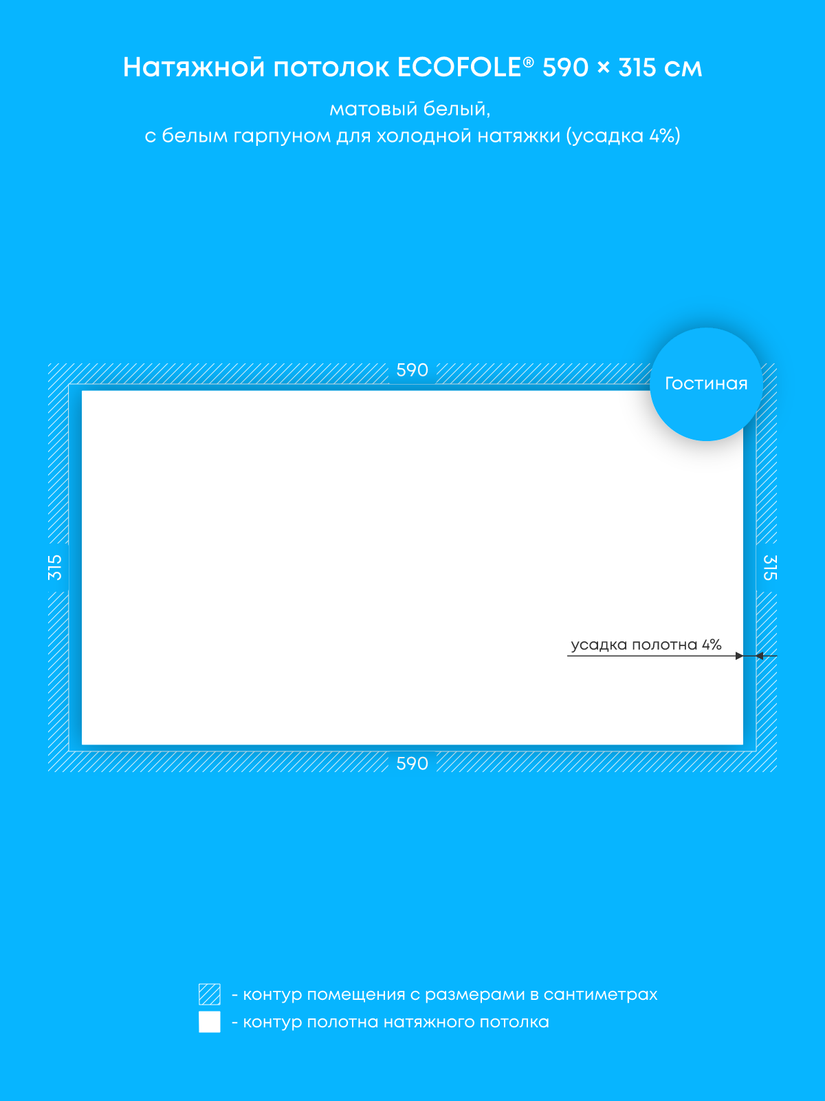 Натяжной потолок белый матовый, изготовленный по индивидуальным размерам покупателя, для гостиной площадью 18.6 м2