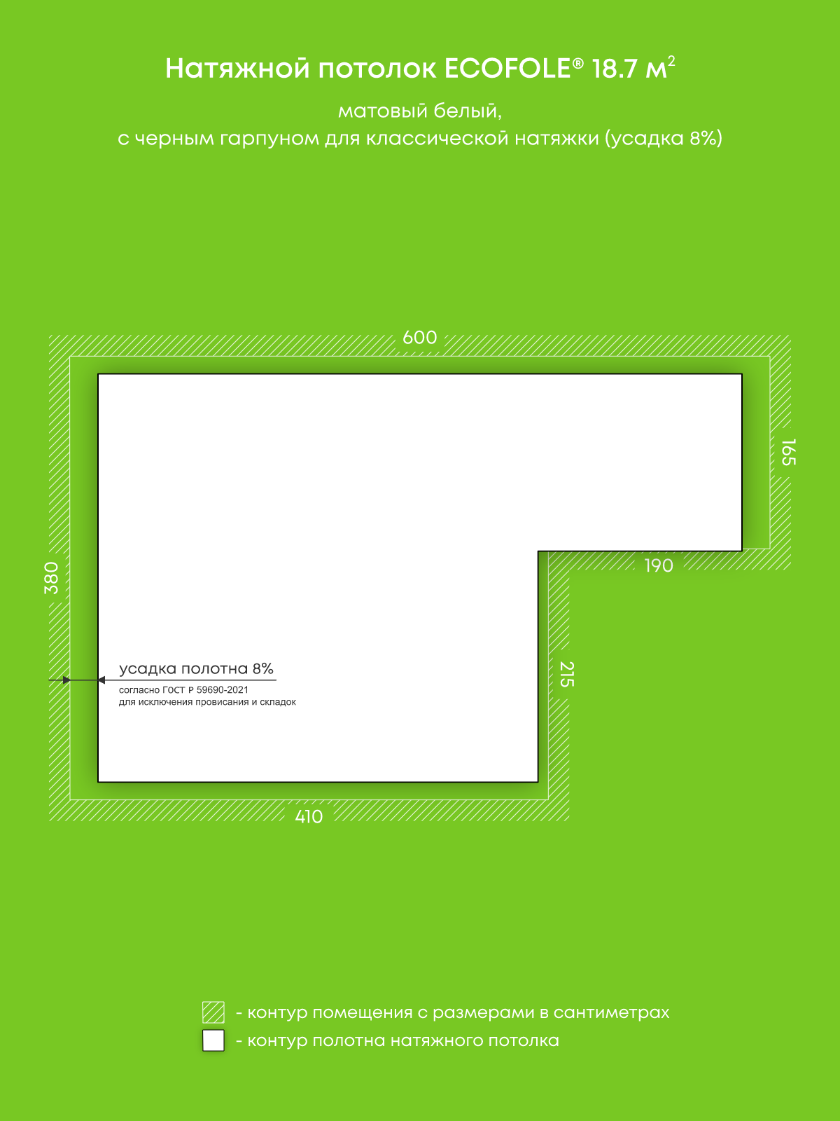 Натяжной потолок белый матовый, изготовленный по индивидуальным размерам покупателя, для помещения площадью 18.7 м2