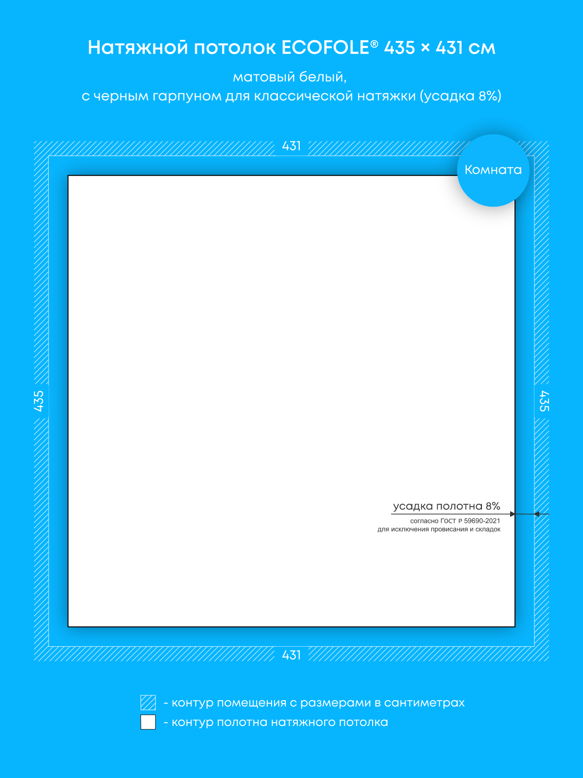 Натяжной потолок белый матовый с черным гарпуном, классической натяжки, изготовленный по индивидуальным размерам покупателя, для помещения площадью 18.7 м2