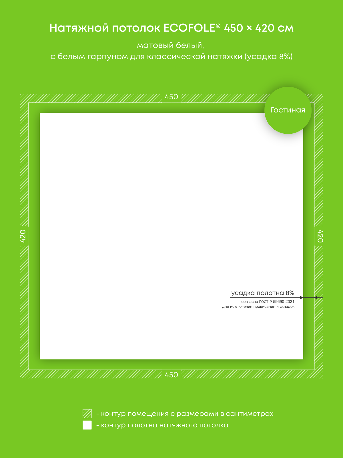 Натяжной потолок белый матовый, классической натяжки, изготовленный по индивидуальным размерам покупателя, для помещения площадью 18.9 м2
