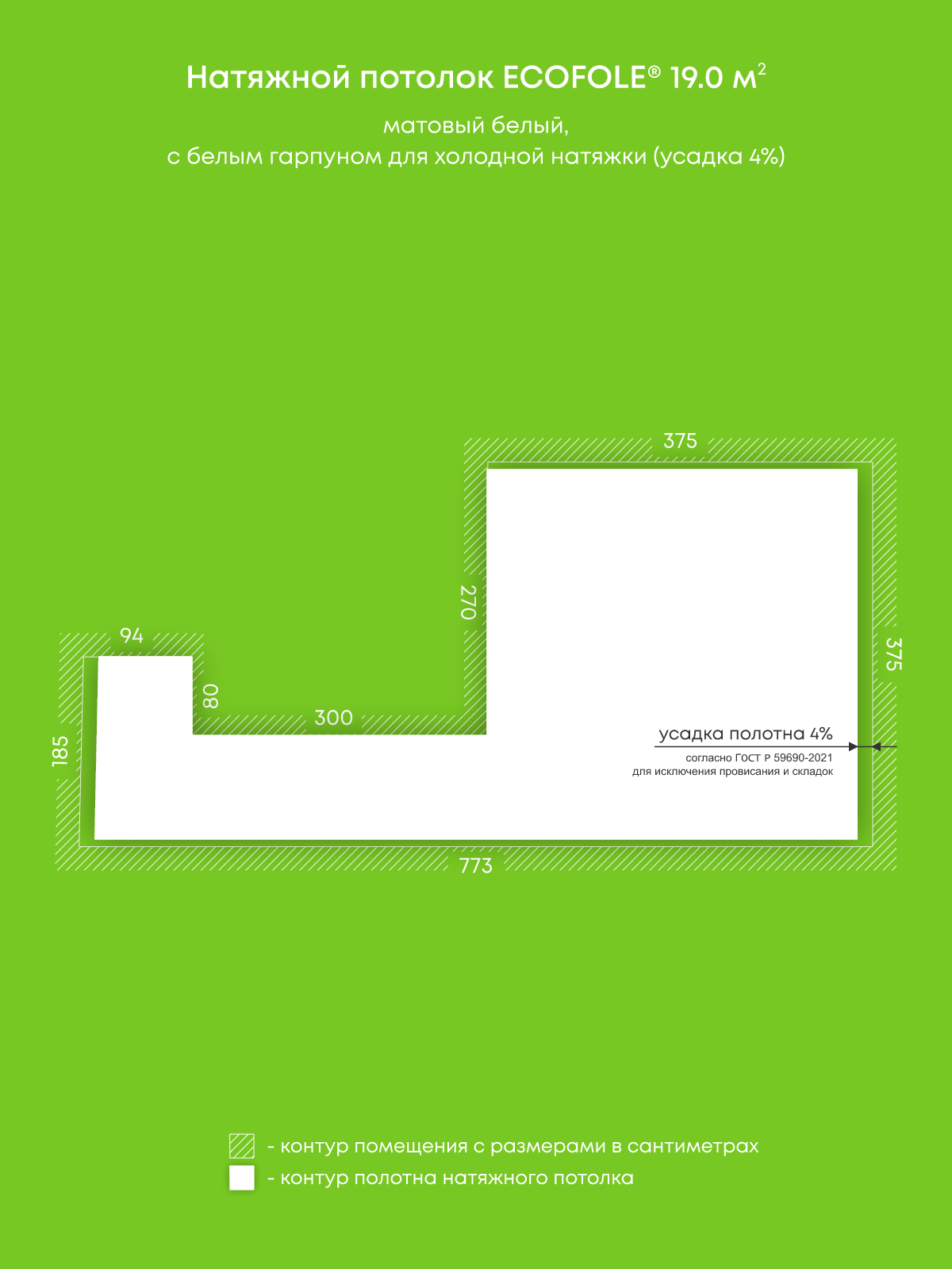 Натяжной потолок белый матовый, изготовленный по индивидуальным размерам покупателя, для помещения площадью 19 м2