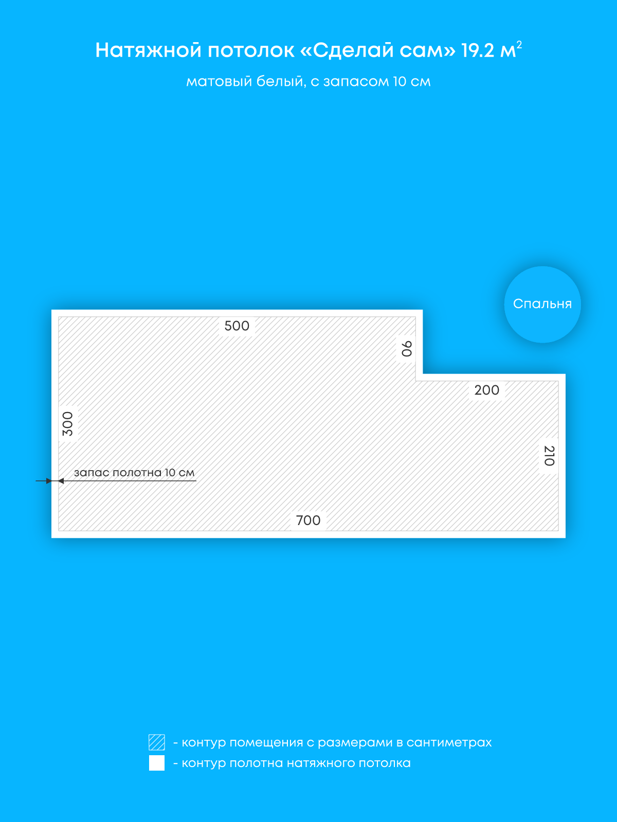 Натяжной потолок белый матовый, изготовленный по индивидуальным размерам покупателя, для спальни площадью 19.2 м2