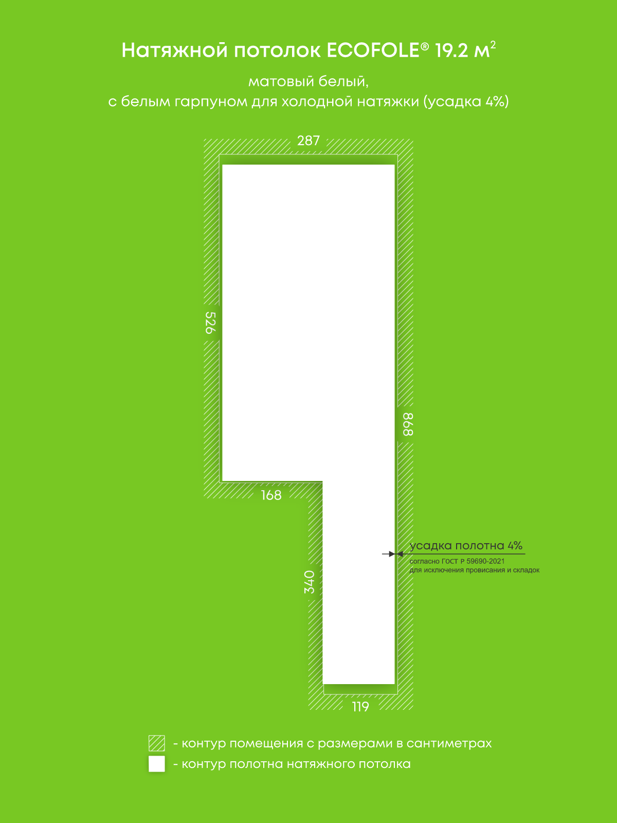 Натяжной потолок белый матовый, изготовленный по индивидуальным размерам покупателя, для комнаты площадью 19.2 м2