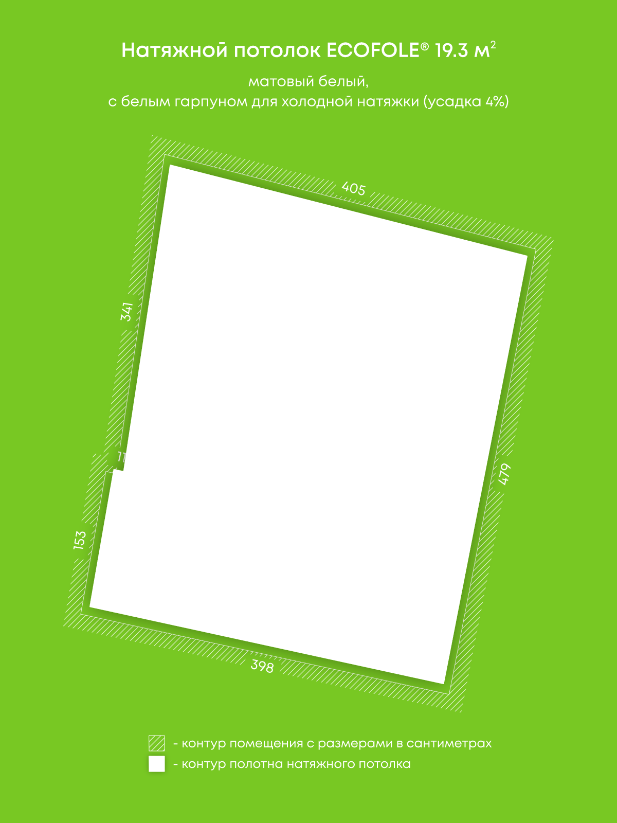 Натяжной потолок белый матовый, изготовленный по индивидуальным размерам покупателя, для гостиной площадью 19.3 м2