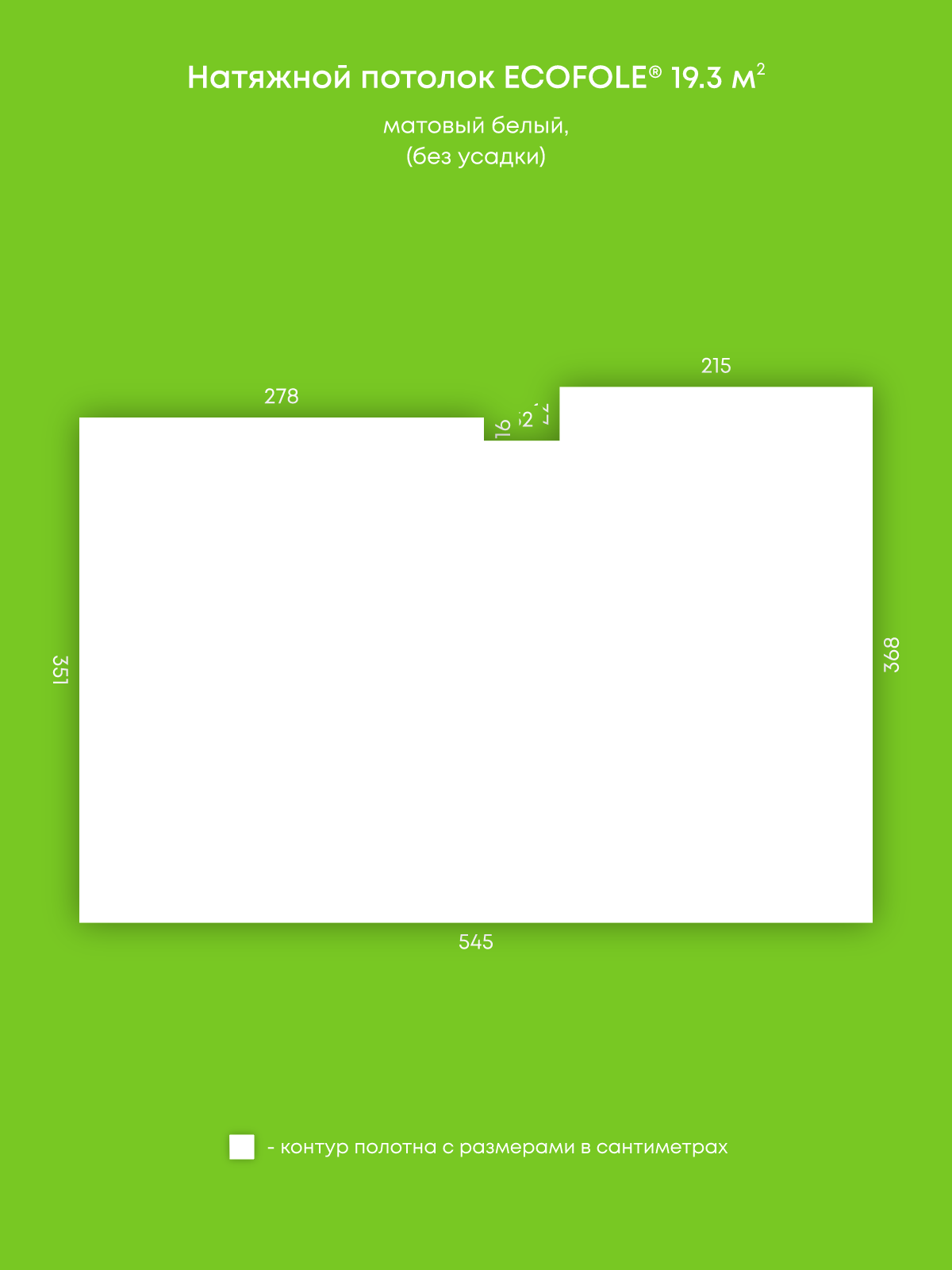 Натяжной потолок белый матовый, изготовленный по индивидуальным размерам покупателя, для помещения площадью 19.3 м2
