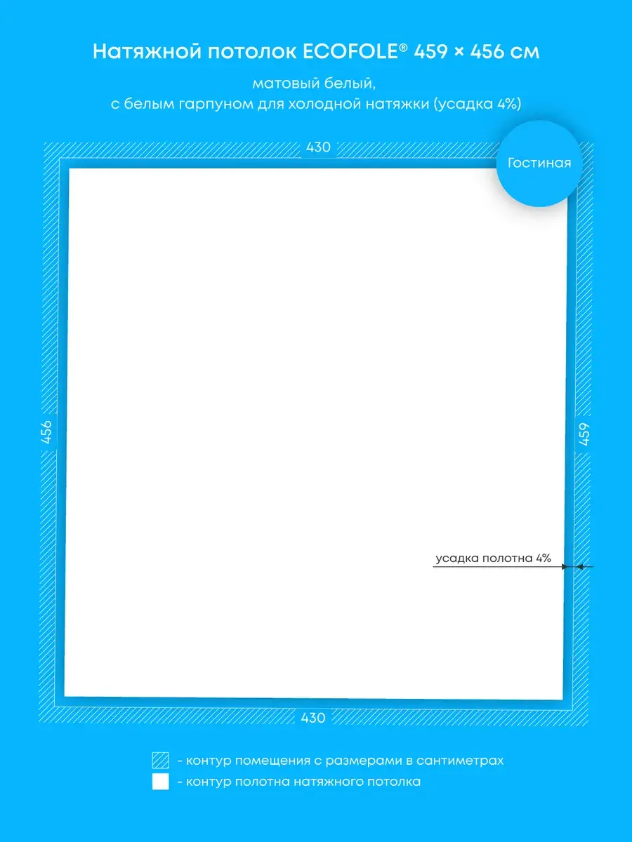 - Технология производства натяжного потолка предусматривает его усадку на 4-9% для исключения провисания после монтажа, т.е. фактический размер готового потолка составляет на 4-9% меньше исходного размера помещения и не является браком;