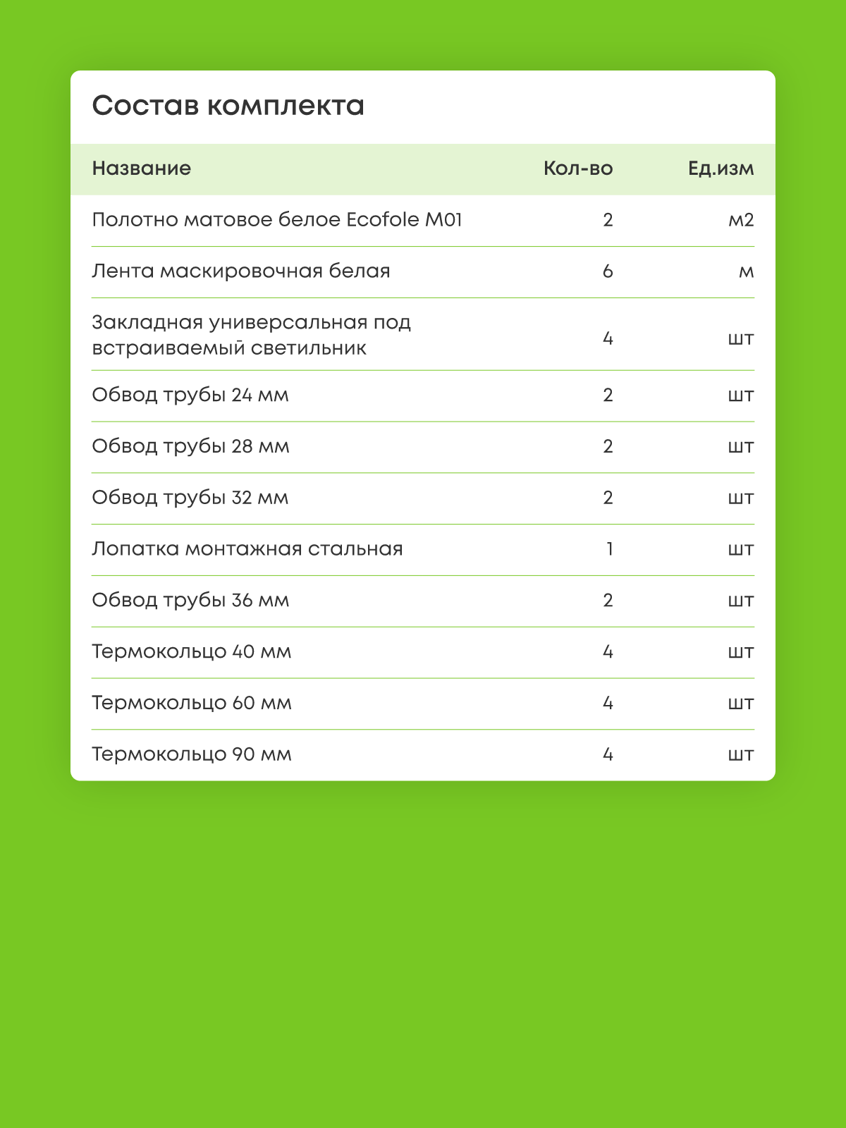 Натяжной потолок белый матовый, изготовленный по индивидуальным размерам покупателя, для помещения площадью 2 м2