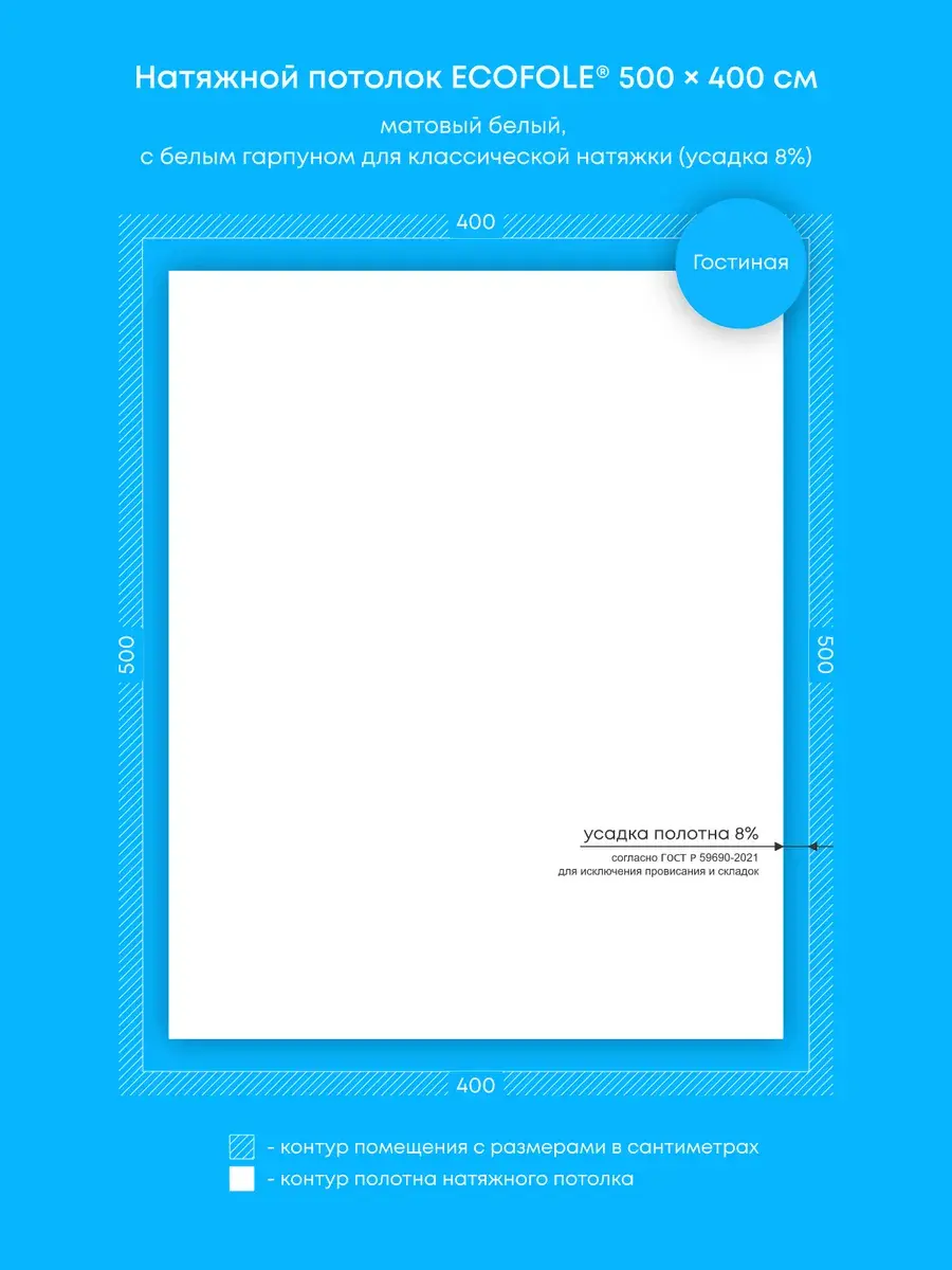 - Технология производства натяжного потолка предусматривает его усадку на 4-9% для исключения провисания после монтажа, т.е. фактический размер готового потолка составляет на 4-9% меньше исходного размера помещения и не является браком;