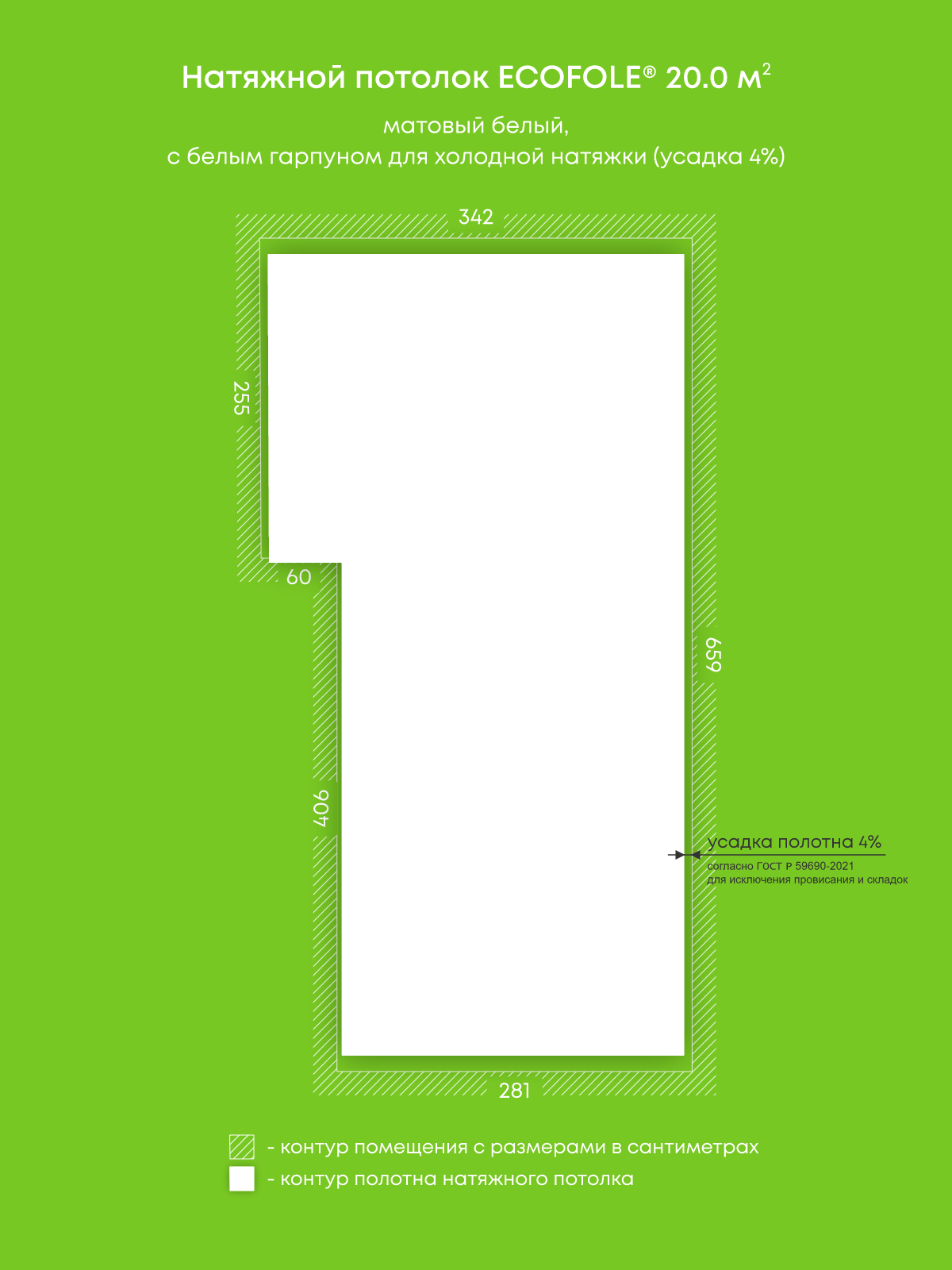 Натяжной потолок белый матовый, изготовленный по индивидуальным размерам покупателя, для спальни площадью 20 м2