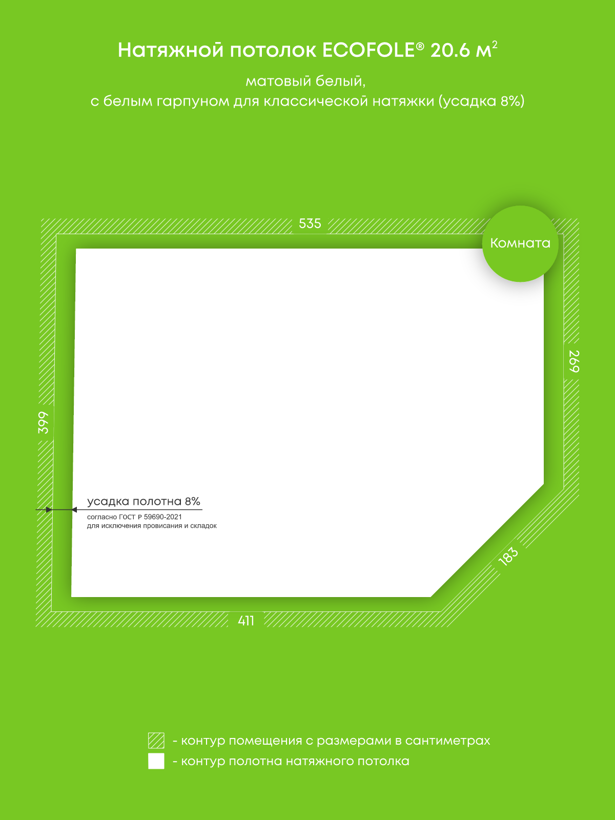 Натяжной потолок белый матовый, изготовленный по индивидуальным размерам покупателя, для комнаты площадью 20.6 м2