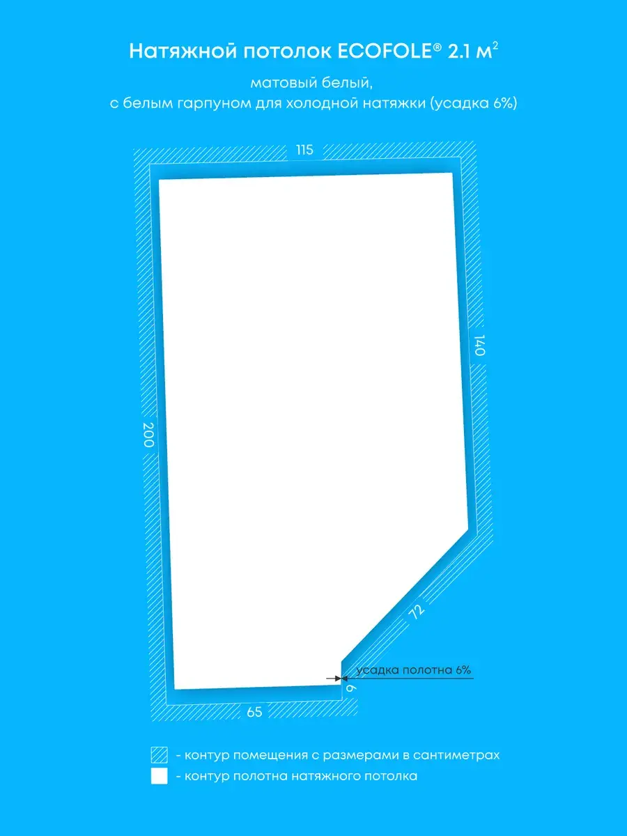 Натяжной потолок белый матовый, холодной натяжки, изготовленный по индивидуальным размерам покупателя, для помещения площадью 2.1 м2