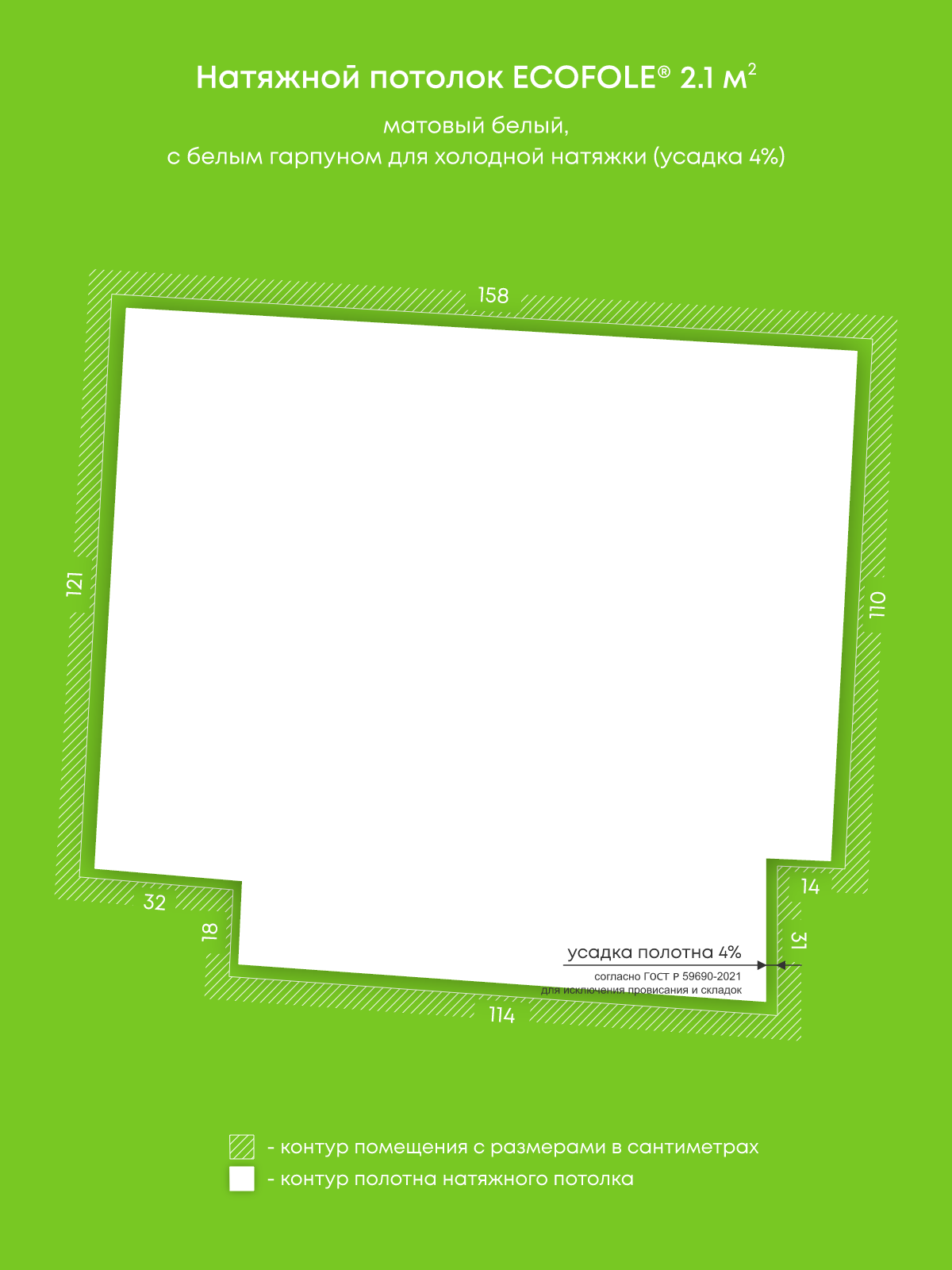 Натяжной потолок белый матовый, изготовленный по индивидуальным размерам покупателя, для ванной площадью 2.1 м2